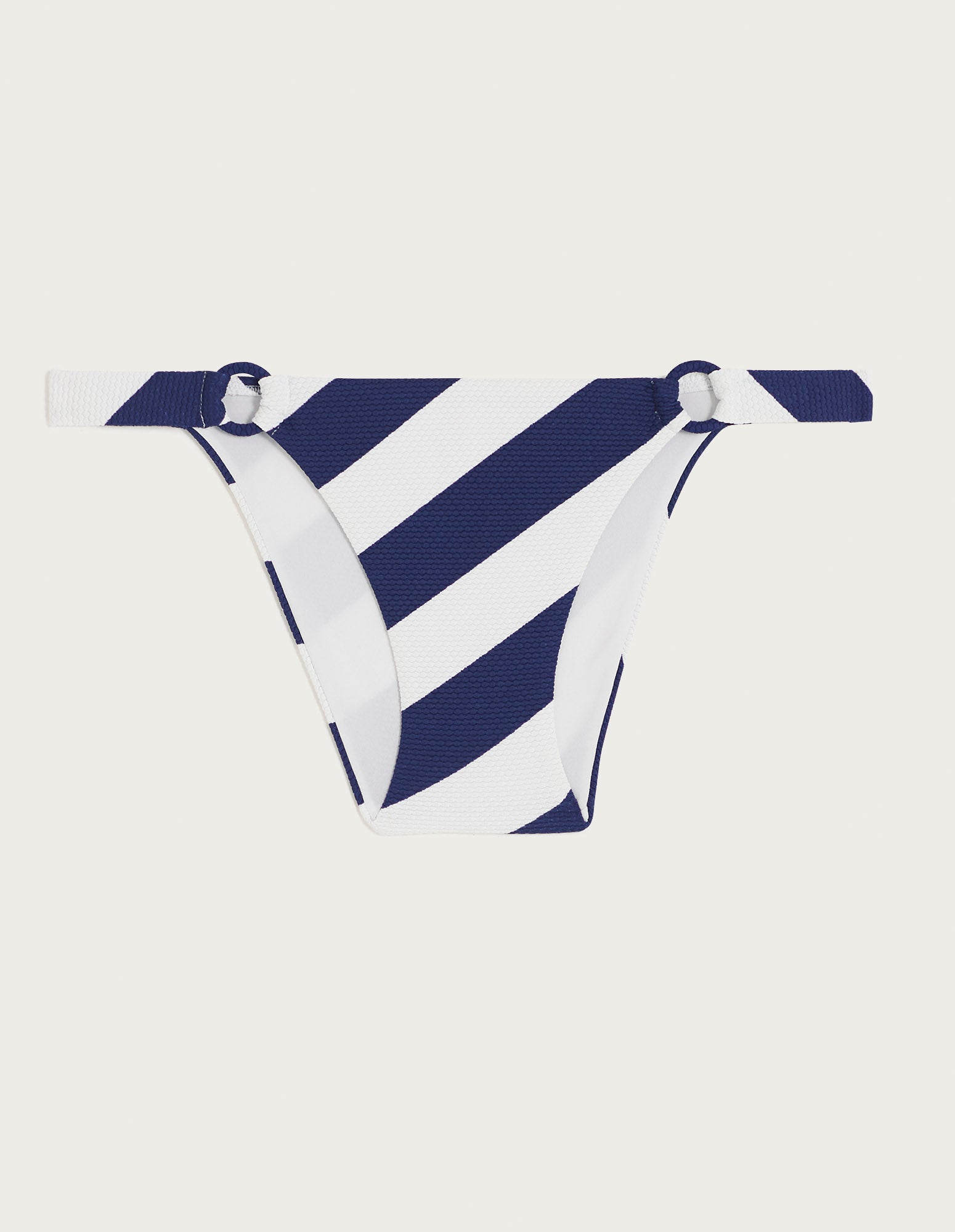 Envie d’un look tendance et d’une ambiance estivale ? La ligne de maillots de bain Dispy est faite pour vous ! Toute la collection est confectionnée en tissu jacquard nid d’abeille, confortable et de qualité, pour un ajustement parfait. Son élégant motif à rayures obliques blanches et bleues sublime vos courbes et ajoute une touche de sophistication à vos tenues de plage. Ce string est synonyme de sensualité et de raffinement ; ses deux anneaux latéraux, recouverts de tissu, lui confèrent une touche d’élégance supplémentaire. À associer parfaitement avec d’autres modèles de la ligne ou d’autres collections emblématiques.