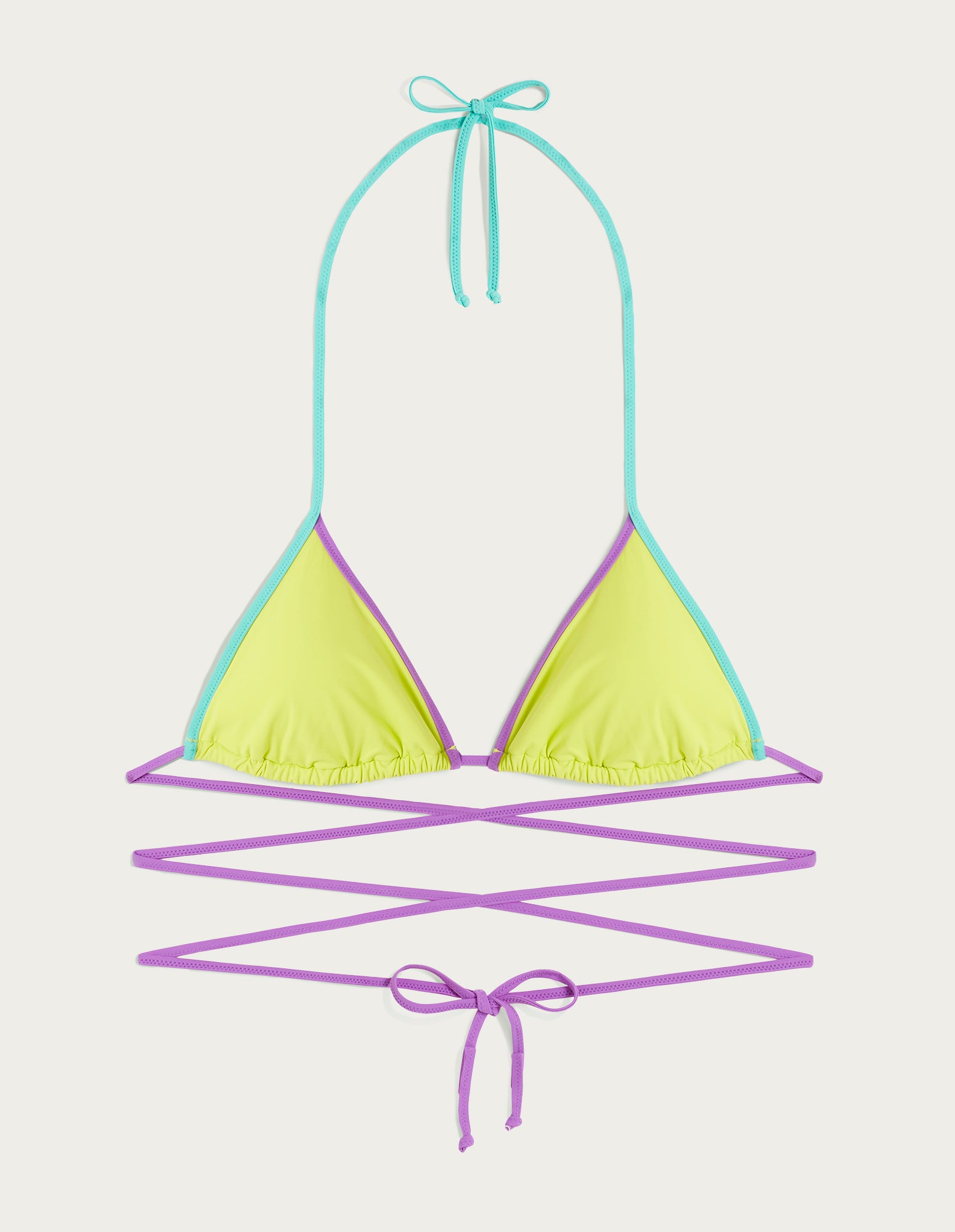 Pour des looks estivaux aux couleurs vives et à la pointe des tendances, découvrez la ligne de maillots de bain Candie. Confectionné en color block améthyste et citron vert avec un liseré vert contrastant, il est parfait pour s’associer à la collection Emily. Tous les modèles offrent une coupe minimaliste et ultra tendance, confectionnés en douce charmeuse REC, pour un confort optimal à la plage. Ce triangle coulissant, doté de bonnets amovibles et de longs lacets, vous permettra de créer des laçages uniques et tendance. Un modèle extrêmement polyvalent, qui mettra en valeur toutes les silhouettes.