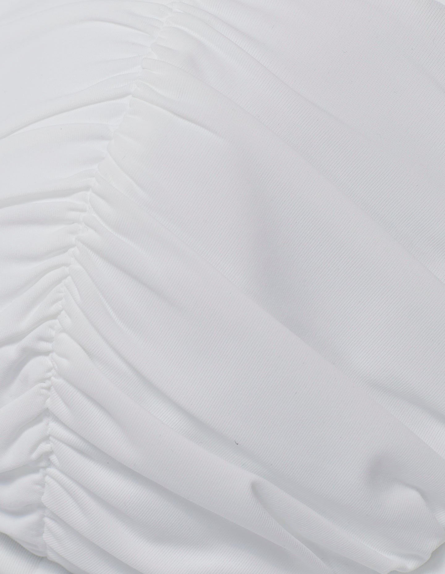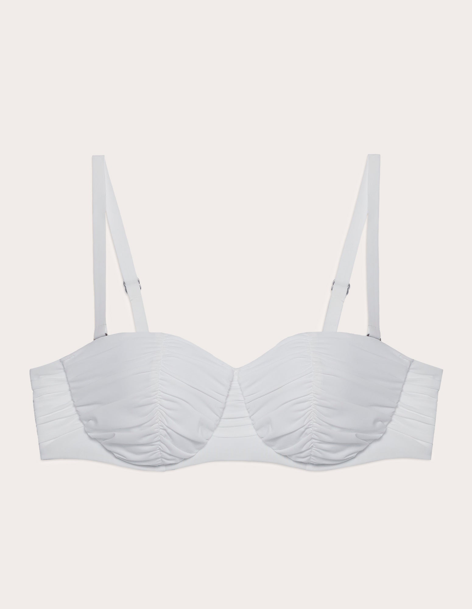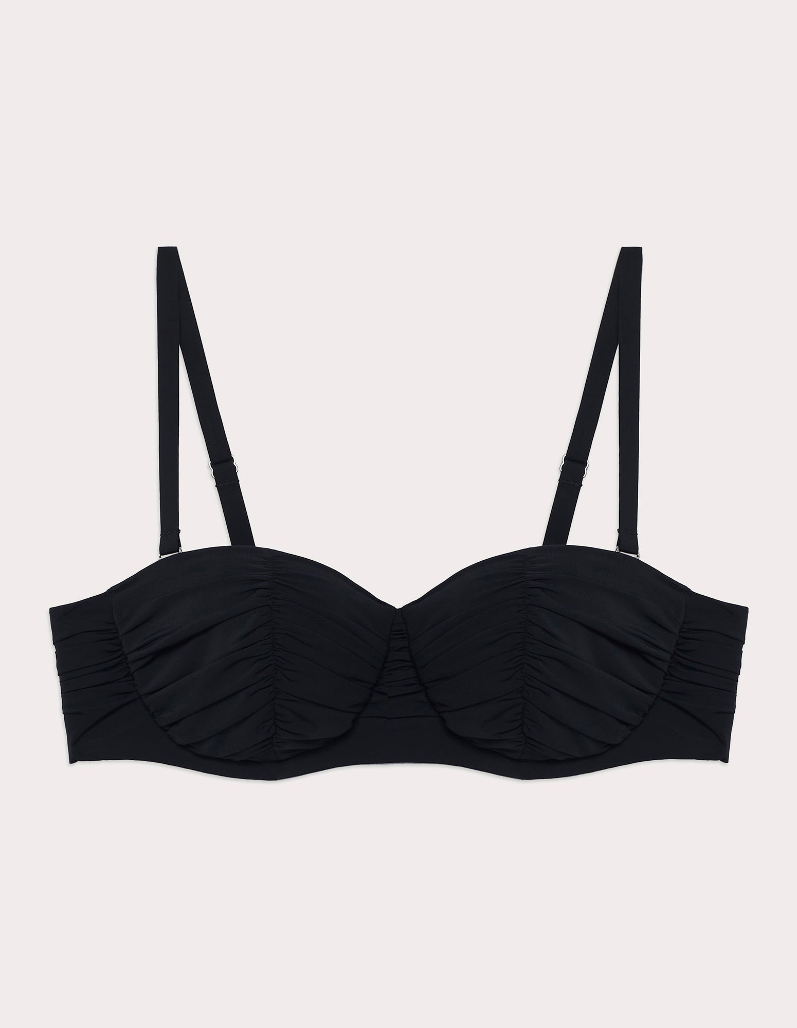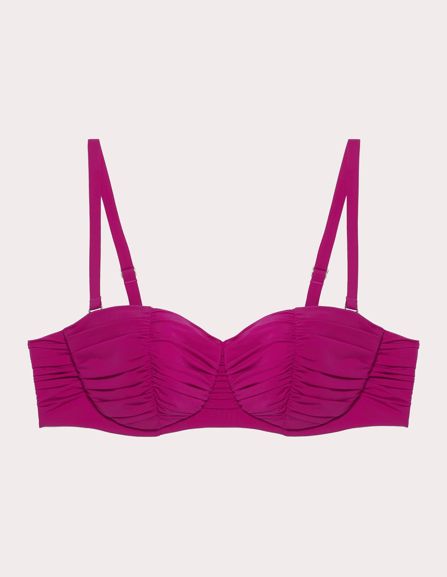 Maillot de bain bandeau préformé avec armatures, bonnets préformés et drapé devant pour plus de volume et de mouvement. Bretelles fines, réglables et amovibles. Le balconnet est en microfibre recyclée mate. Disponible en 3 coloris.