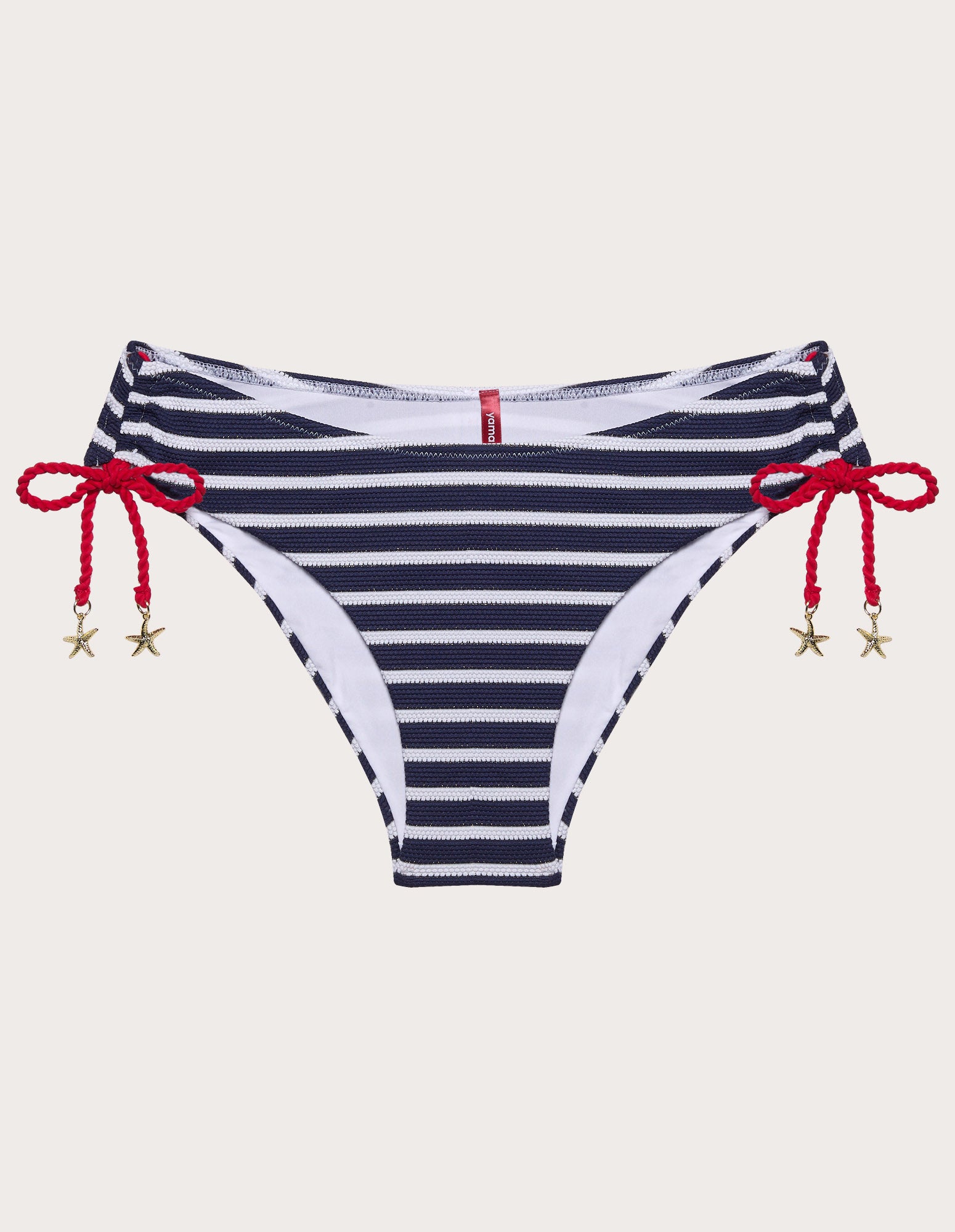 Bas de bikini femme avec cordons de serrage latéraux réglables, conçu pour un ajustement confortable et personnalisable. Son design à rayures horizontales bleu marine et blanches, inspirées du style marinière, lui confère un look frais et intemporel. Les liens rouges contrastants, noués en nœud, sont ornés de petites étoiles dorées pendantes, apportant une touche raffinée et féminine. Sa coupe classique et ses finitions élastiques assurent une adhérence parfaite, ce qui en fait le bas idéal pour toutes vos activités à la plage ou à la piscine.