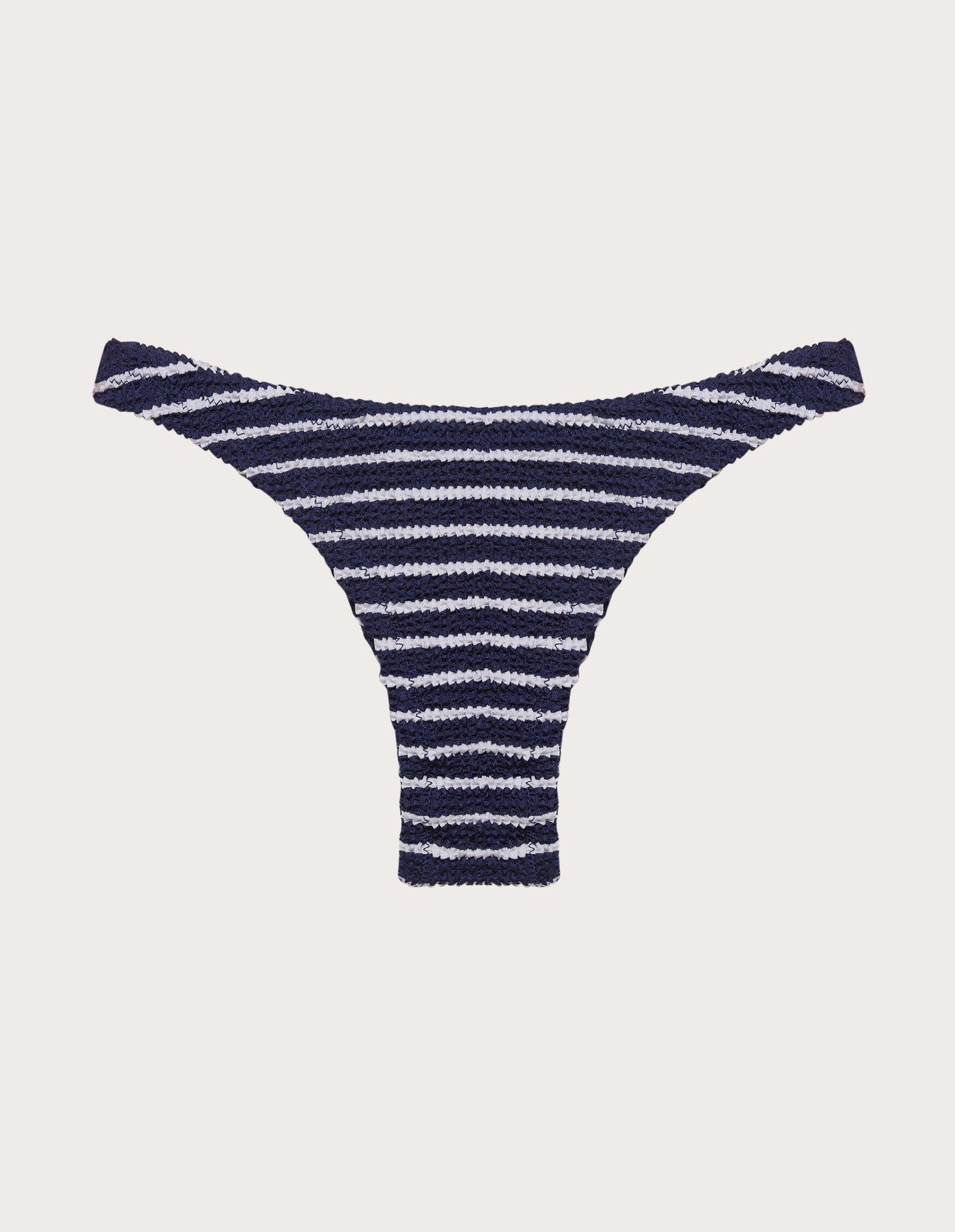 Bas de bikini taille basse à coupe brésilienne offrant une couverture réduite et une silhouette visuellement allongée. Confectionné en seersucker extensible, ce modèle allie confort et style grâce à sa surface tridimensionnelle qui lui confère un aspect texturé et raffiné. Le tissu élastique assure un ajustement parfait et un bon maintien lors des mouvements. Le motif à rayures horizontales bleu marine et blanc souligne le style marin, conférant au vêtement une allure fraîche et estivale.