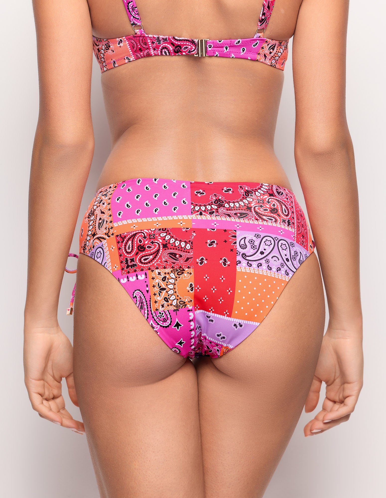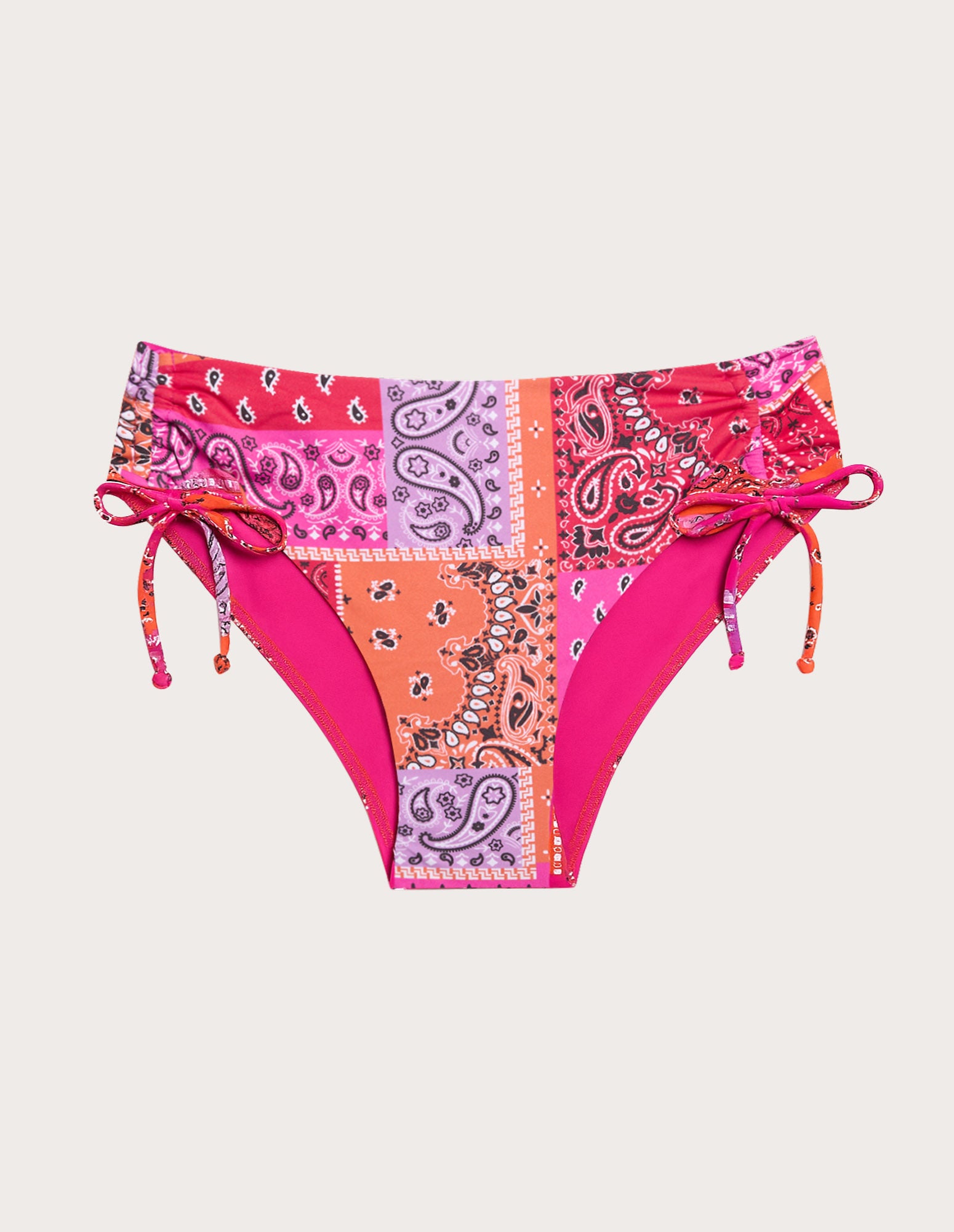Bas de bikini taille haute au design féminin, conçu pour offrir plus de couvrance et de confort sans sacrifier le style. Les liens réglables sur les côtés permettent un ajustement personnalisé, épousant élégamment la silhouette. L’imprimé bandana patchwork aux tons vifs fuchsia, orange et lilas apporte une touche dynamique et moderne à ce modèle. Idéal pour celles qui recherchent un style contemporain et polyvalent, il s’associe parfaitement à des hauts coordonnés pour un look de plage complet et raffiné.