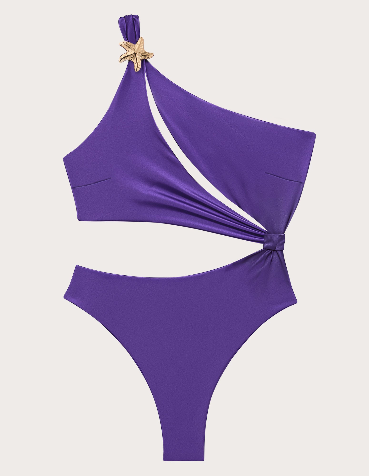 Maillot de bain une pièce asymétrique avec un large décolleté en V devant et derrière, créant un effet de découpe latérale. Confectionné en charmeuse violette brillante, il assure confort et maintien. La taille est soulignée par de légères fronces qui soulignent la silhouette. Détail distinctif, le maillot est orné d’une étoile de mer amovible en métal doré, positionnée sur l’épaule, qui apporte une touche élégante et sophistiquée à l’ensemble.
