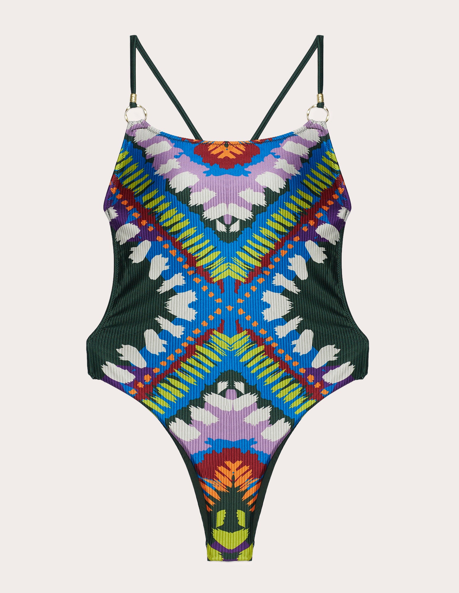 Maillot de bain une pièce pour femme, sans rembourrage, doté de fines bretelles croisées réglables dans le dos et d’accessoires en métal doré. L’échancrure mi-haute allonge la jambe. Disponible en deux coloris.
