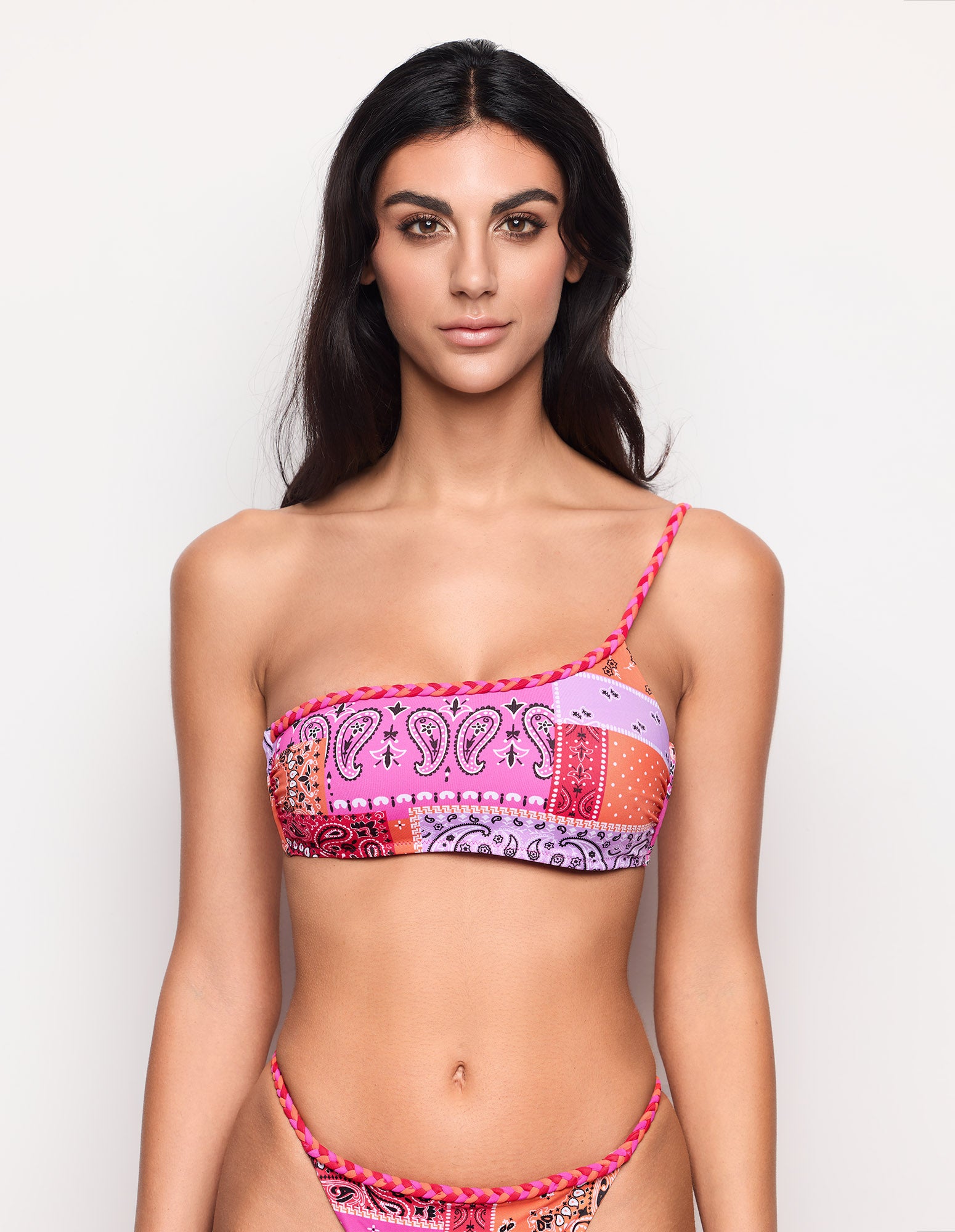 Haut de bikini bralette avec bonnets rembourrés et bretelle unique, orné d’un élégant détail tissé, pour un look artisanal et distinctif. Sa coupe asymétrique sublime le décolleté grâce à un design moderne et original, tandis que la bande sous la poitrine et la fermeture à crochet au dos offrent maintien et confort. L’imprimé patchwork effet bandana fuchsia, orange et lilas apporte dynamisme et caractère, parfait pour un style estival audacieux et contemporain.