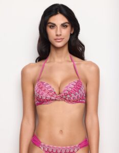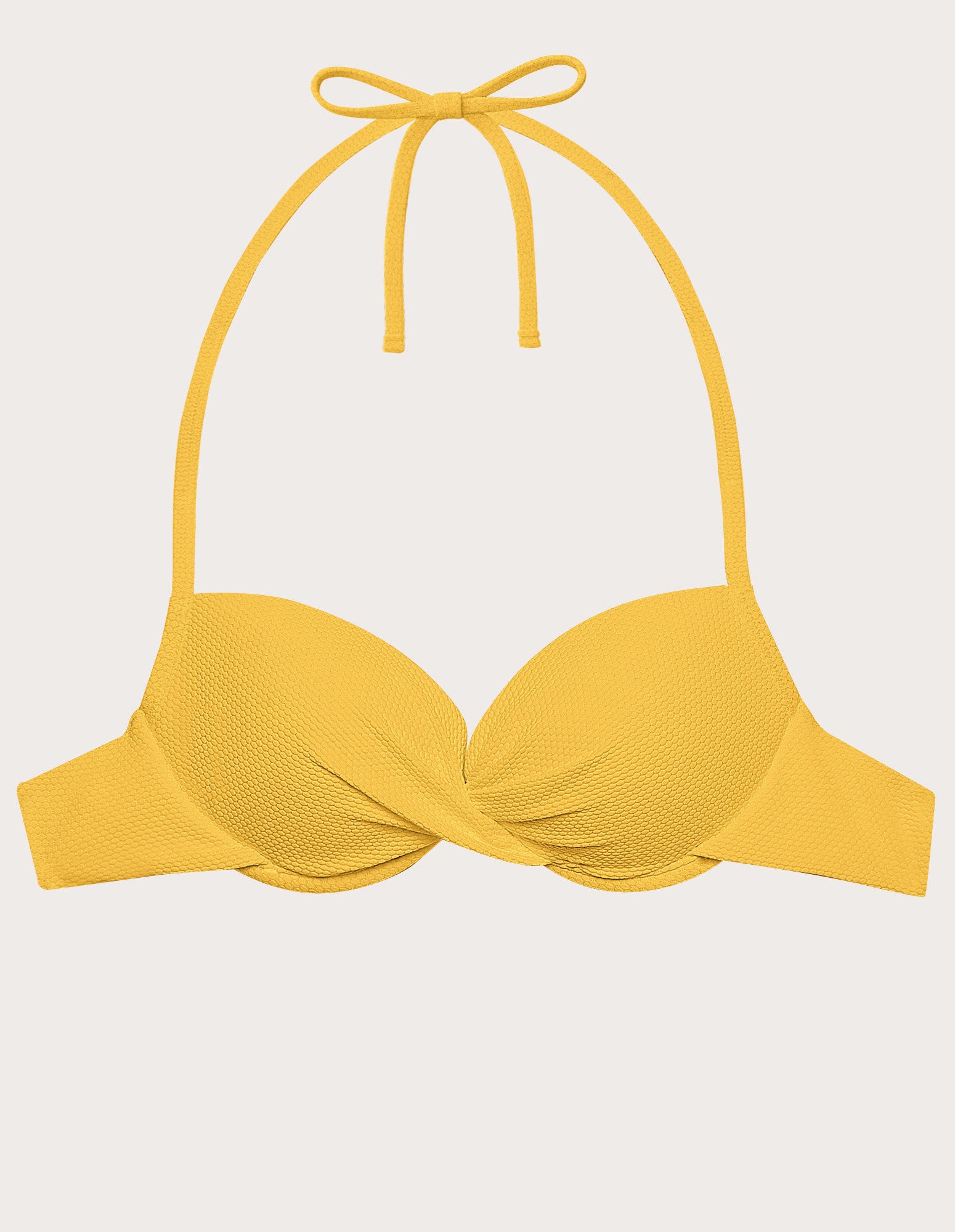 Haut de bikini push-up à bonnets gradués et armatures. Le fronçage central sublime la poitrine. Texture nid d’abeille pour un effet 3D raffiné. Lien à nouer au cou et dos ajustable. Disponible en deux coloris.