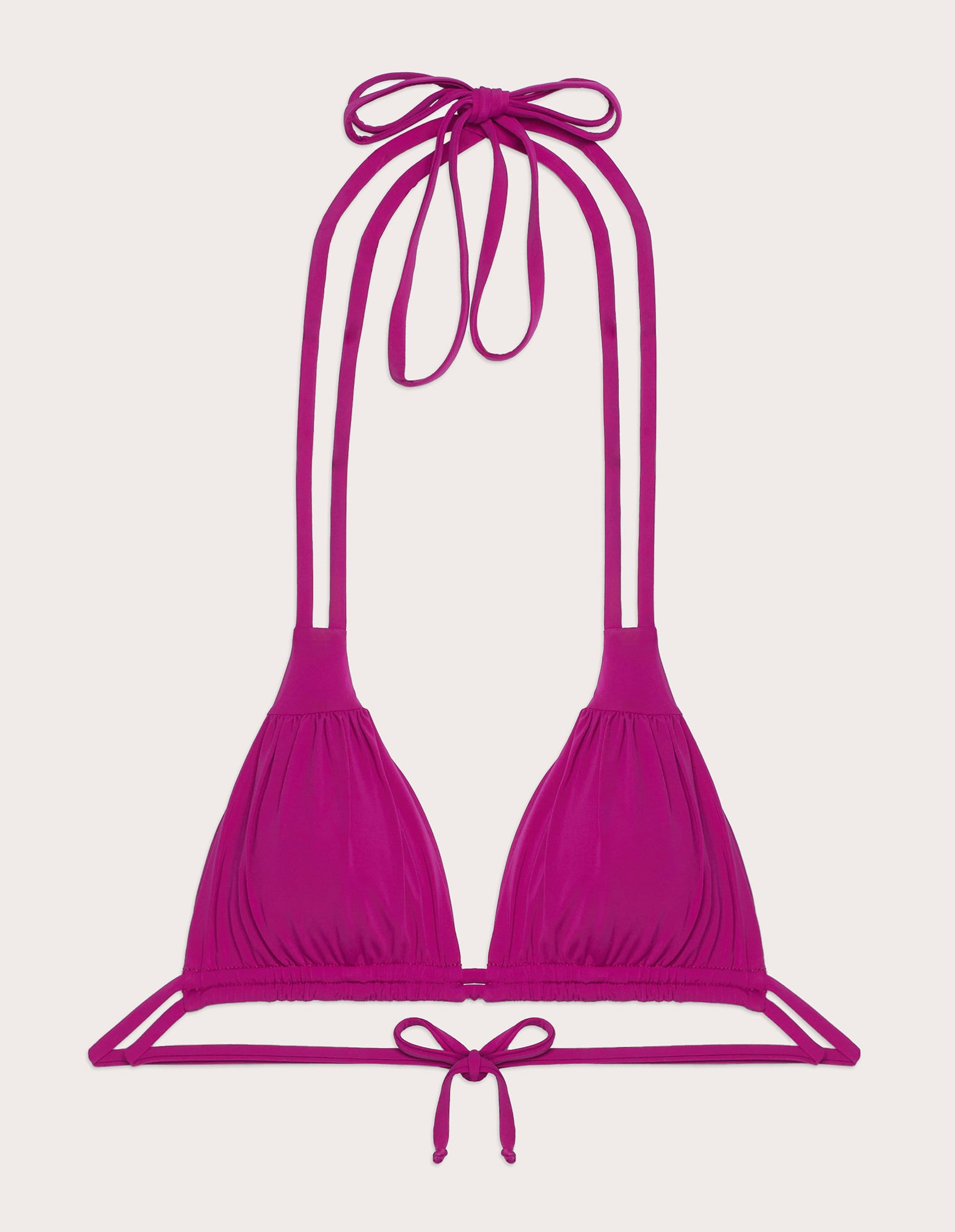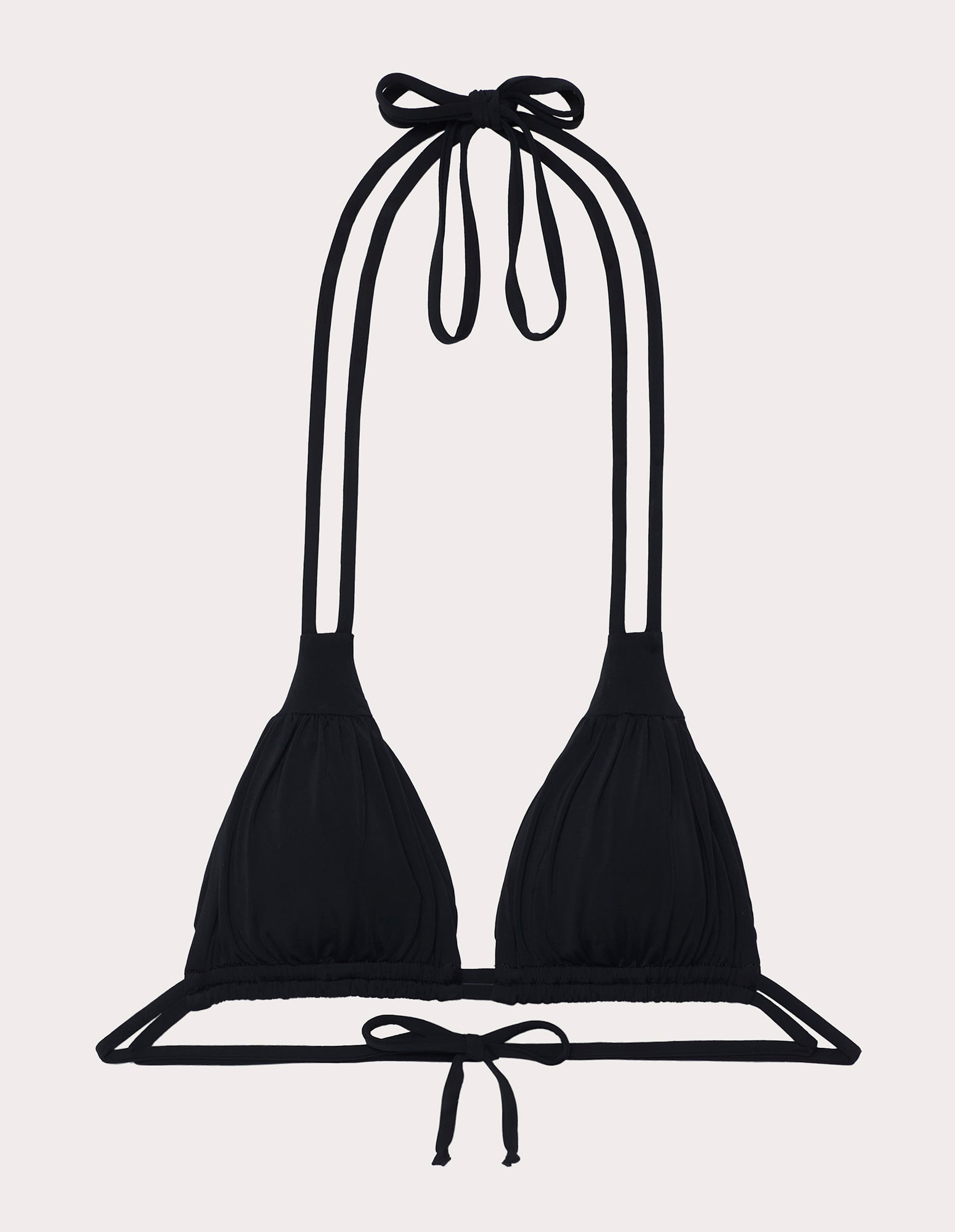 Maillot de bain triangle à bonnets amovibles, doté de deux liens pour un double tour de cou, assurant un meilleur maintien et un ajustement personnalisé. Le triangle présente un léger drapé sur le devant, apportant mouvement et volume. Fabriqué en microfibre recyclée mate. Disponible en deux coloris.