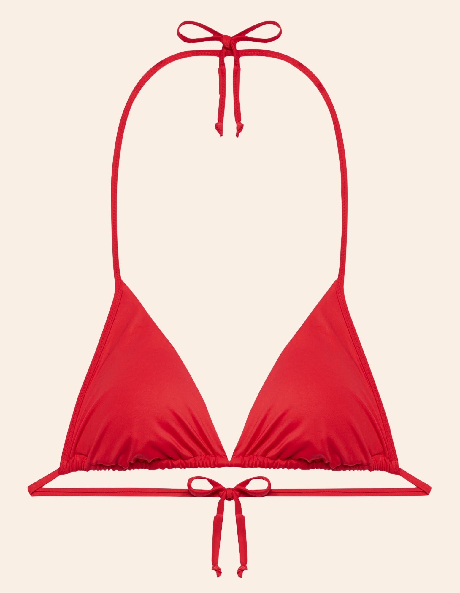 Maillot de bain triangle rouge coulissant sans armatures, avec bonnets amovibles légèrement rembourrés. Fermeture dos par un fin lien et bretelles réglables à nouer dans le cou. Ligne Essentials, confectionnée en tissu Charmeuse à base de fibres recyclées, élastique, résistante au chlore et offrant une protection UV UPF 50+. Ces pièces offrent un ajustement parfait, un confort exceptionnel et une durabilité accrue.