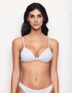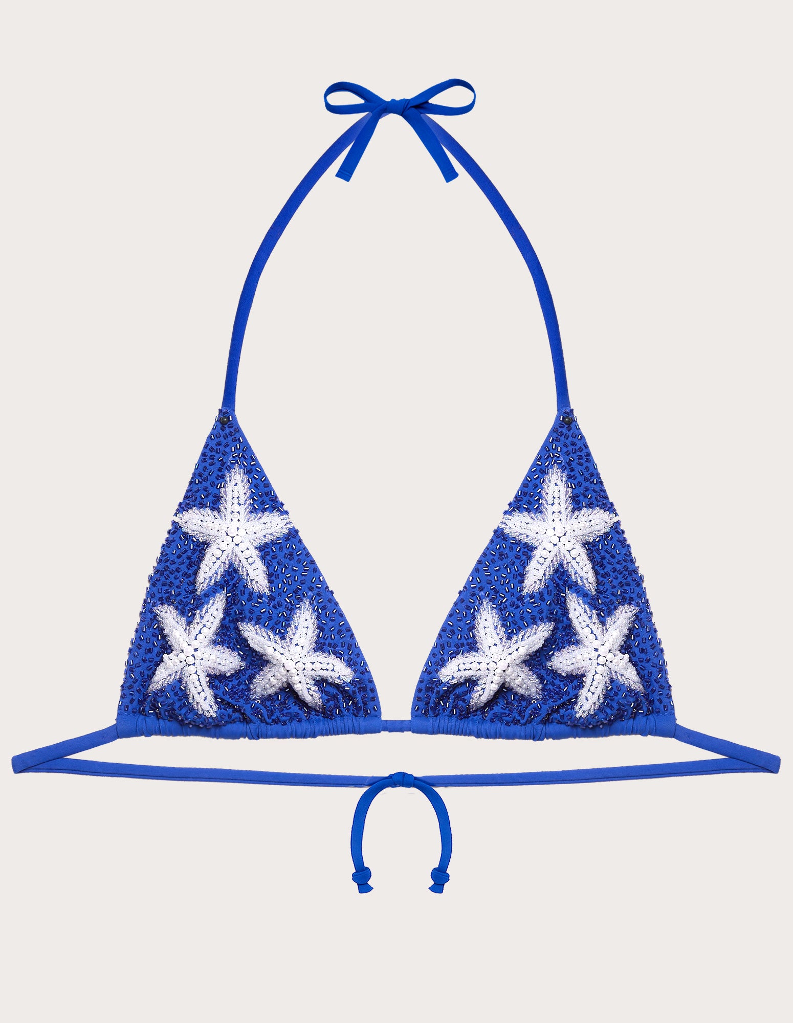 Haut de bikini triangle coulissant en charmeuse fine, orné d’étoiles de mer blanches perlées sur fond bleu profond. De fins liens à nouer au niveau du cou et du dos permettent un ajustement parfait.