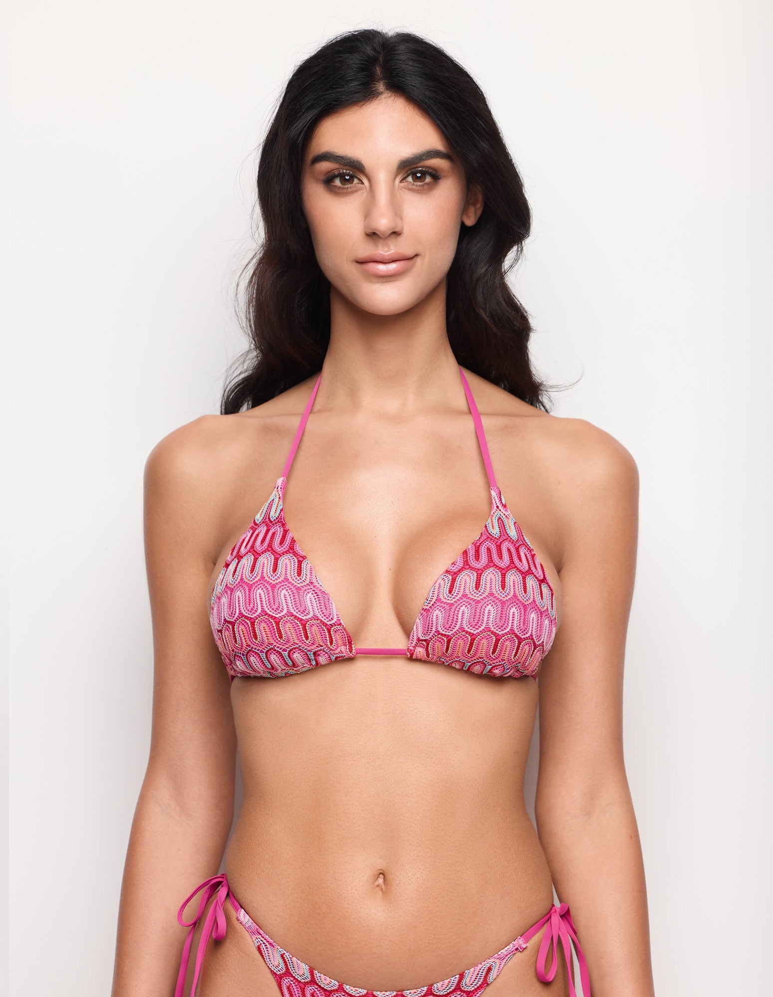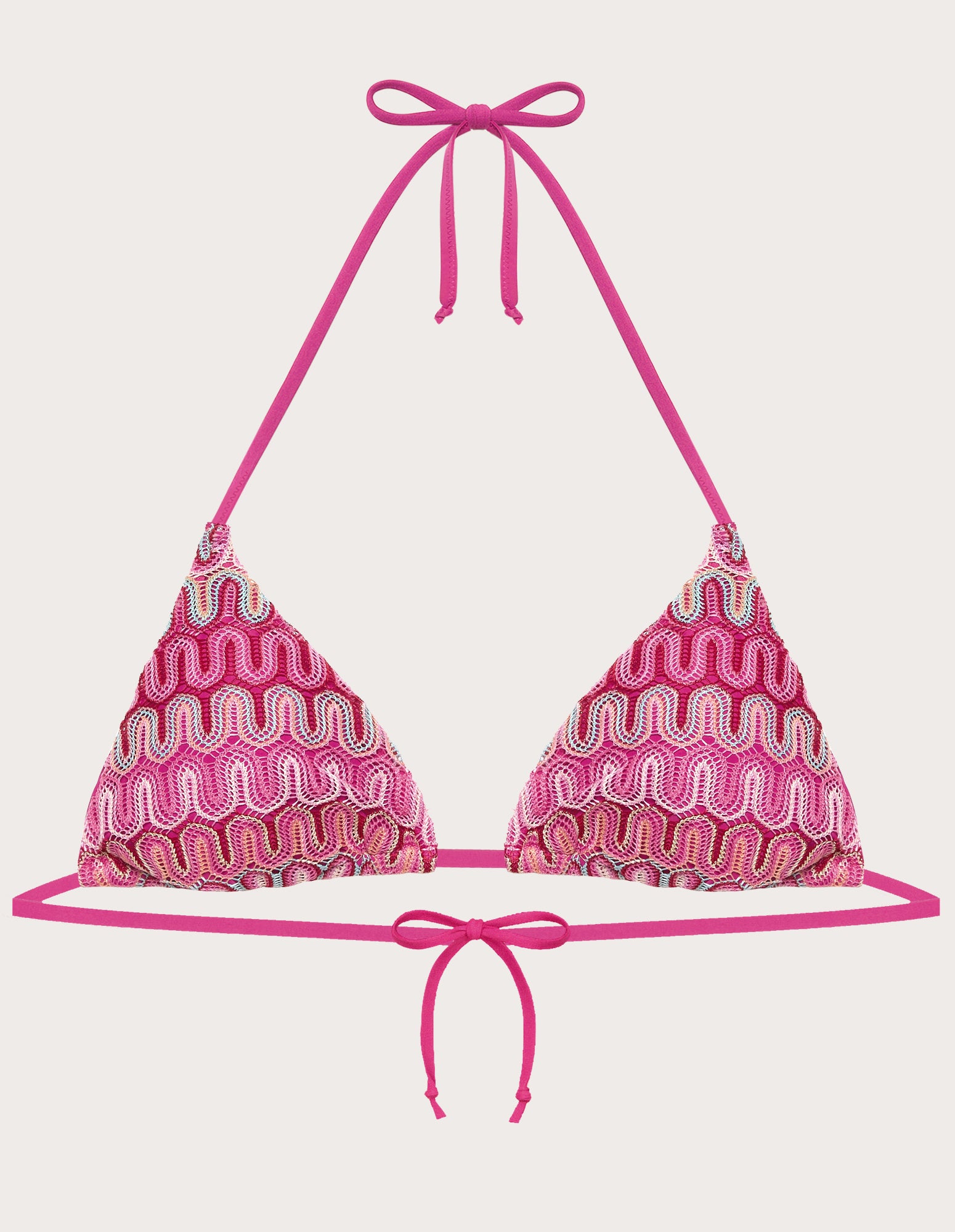 Haut de bikini triangle coulissant sans armatures, avec bonnets amovibles légèrement rembourrés. Fermeture fine à nouer dans le dos et bretelles dos nu à nouer dans le cou. Imprimé ondulé dans les tons rose et fuchsia.