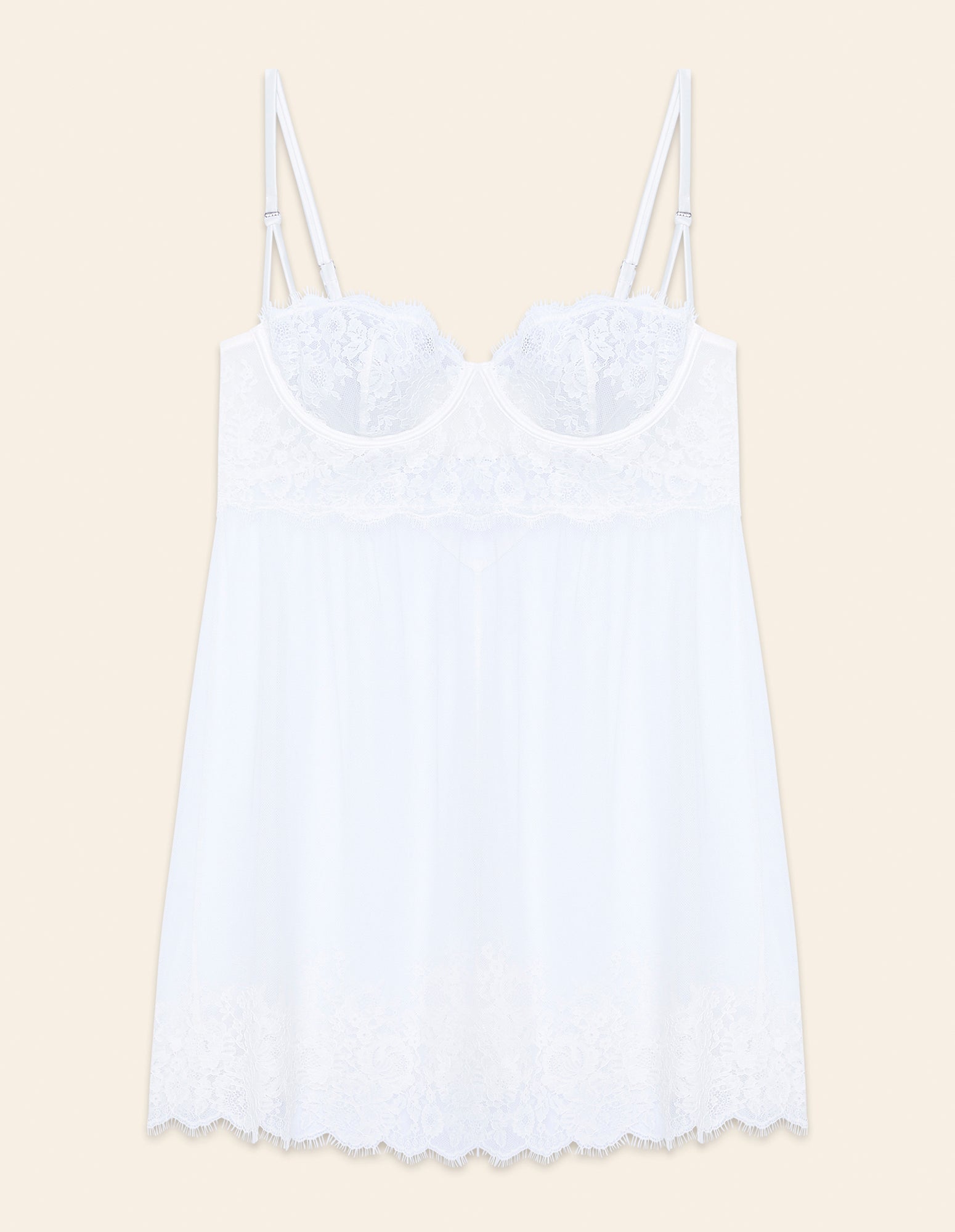 Collection de mariée Jasmine, d’un blanc immaculé, un choix parfait pour la lingerie de mariée. Nuisette élégante en dentelle brodée transparente et résille, avec empiècements en satin. Bonnets non rembourrés ornés d’un petit strass au centre, armatures et petites baleines verticales sur les côtés pour un meilleur maintien. Fines bretelles réglables.