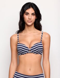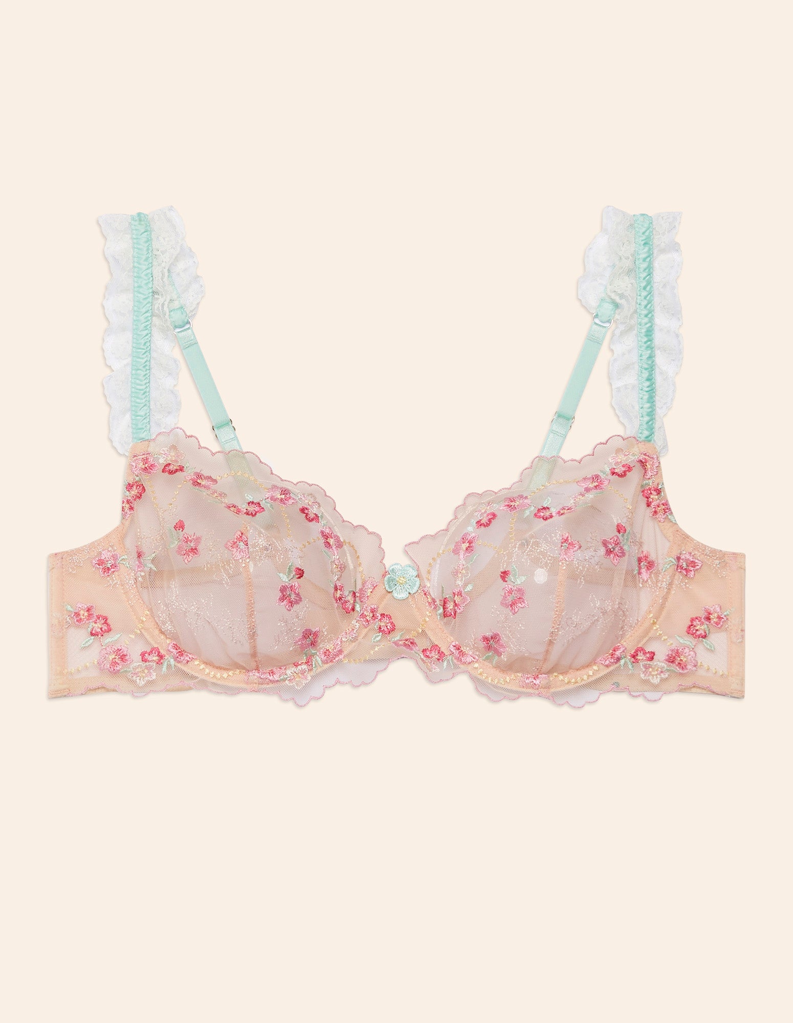 Soutien-gorge balconnet non doublé à armatures, en tulle et dentelle, orné de broderies florales dans les tons roses et doté de bonnets différenciés. Le balconnet Melissa est doté de bretelles bleu clair à volants blancs, réglables.