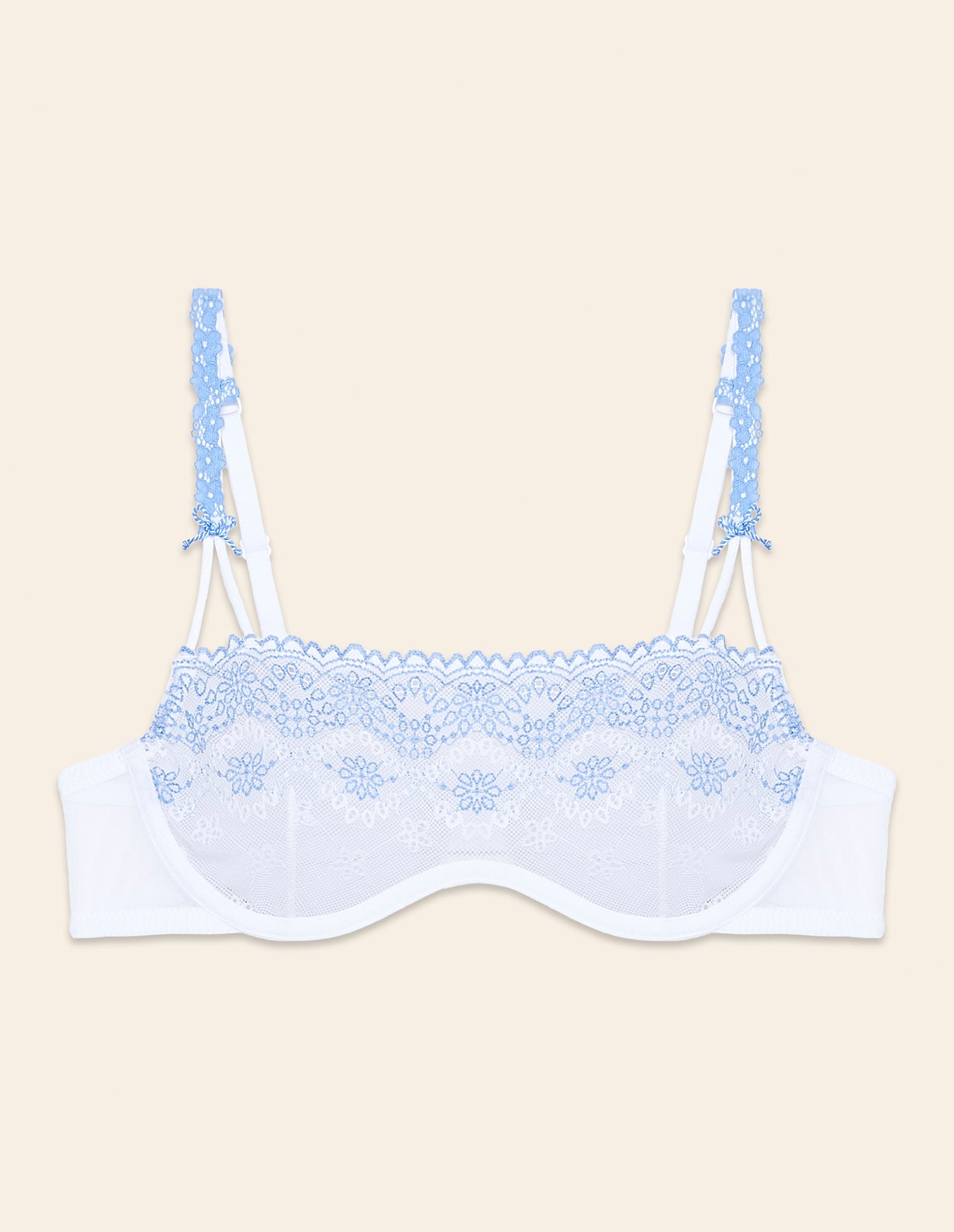 Bustier blanc à armatures, non rembourré, orné de dentelle brodée bleu clair, rehaussé de petites touches florales bleues au centre. Ses fines bretelles réglables sont ornées de détails en dentelle florale bleue. La fermeture au dos est assurée par des crochets confortables.
