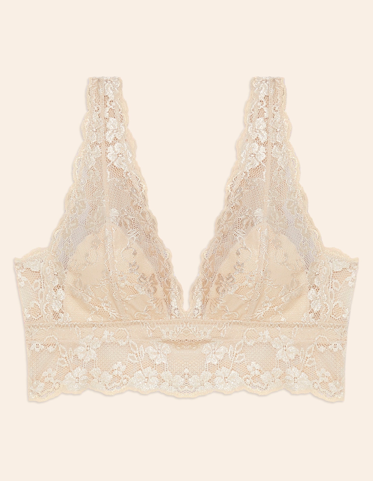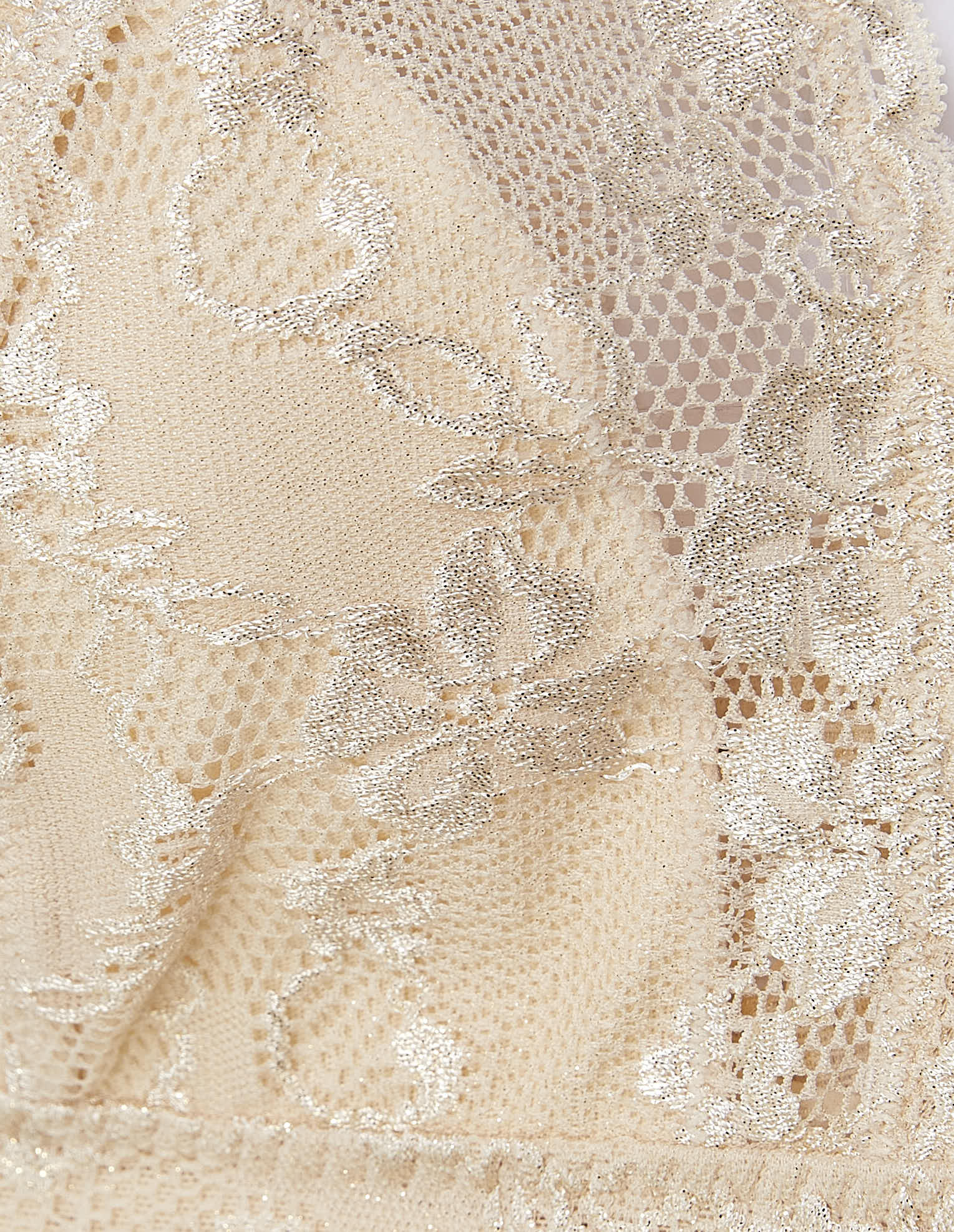 Bralette en dentelle laminée, douce et confortable. Cette bralette crème, sans rembourrage ni armatures, ornée de broderies précieuses et de délicats motifs floraux, est la pièce idéale pour une parure de lingerie tendance. DENTELLE LAMINÉE, 90 % PA, 10 % EA.