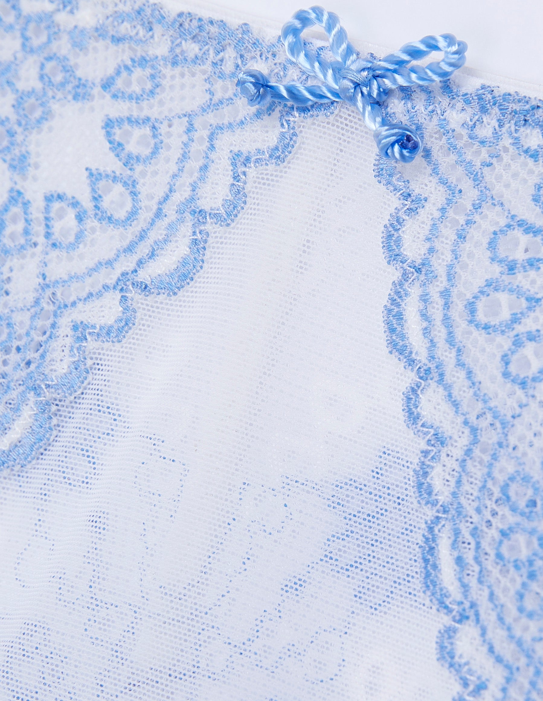 Slip brésilien en tulle blanc avec dentelle brodée bleu clair pour plus de mouvement. Tissus fabriqués à partir de fibres recyclées.