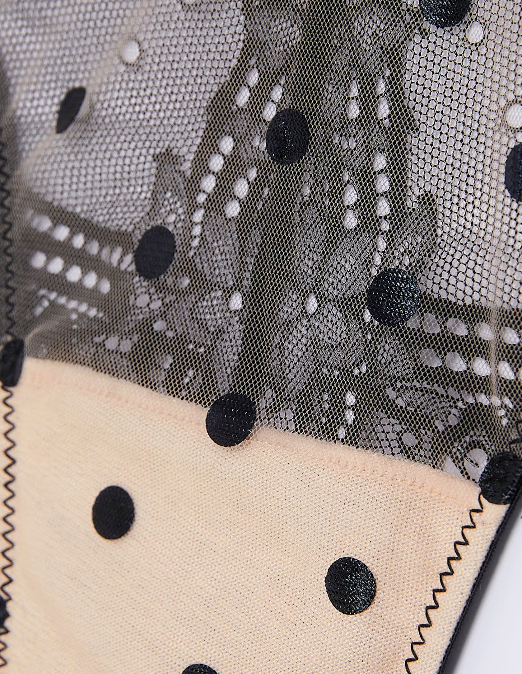 Culotte brésilienne Délice en tulle imprimé couleur chair avec bordure en dentelle noire. Fabriquée à partir de fibres recyclées. Le devant est orné d’un petit nœud en satin, tandis que le dos est entièrement en dentelle.