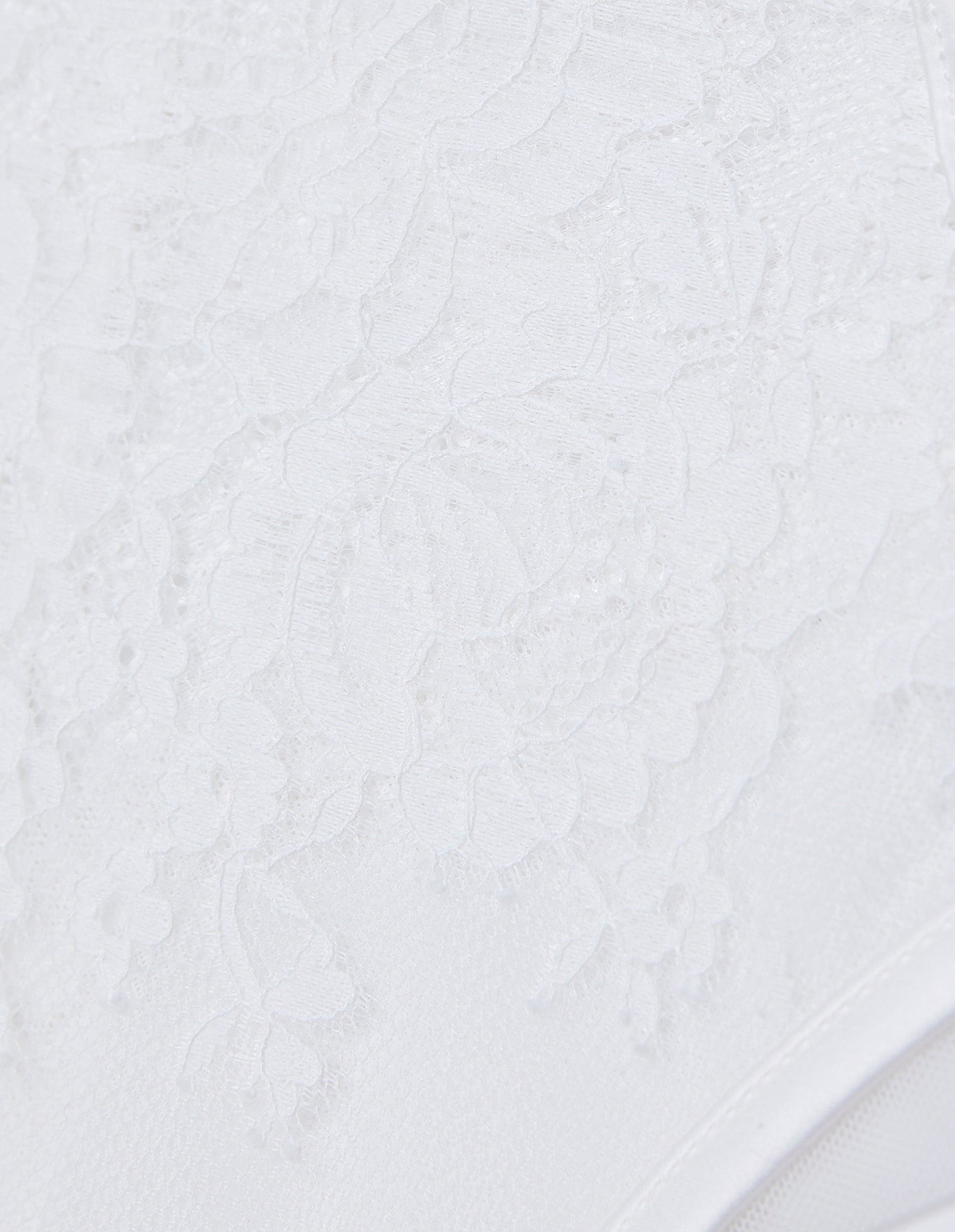 Collection Jasmine, d’un blanc immaculé, un choix parfait pour la lingerie de mariée. Culotte brésilienne en dentelle, résille et tulle, avec un effet semi-transparent et des empiècements en satin.