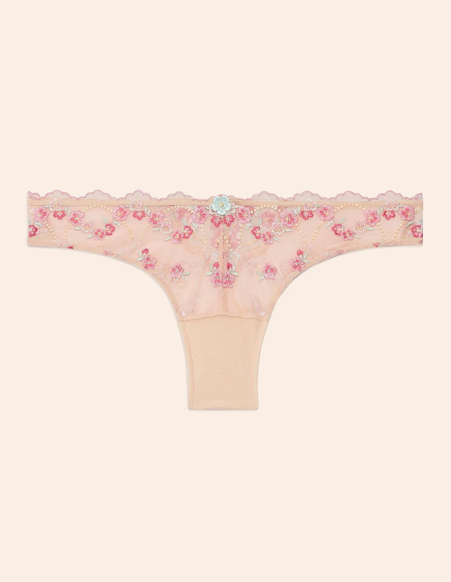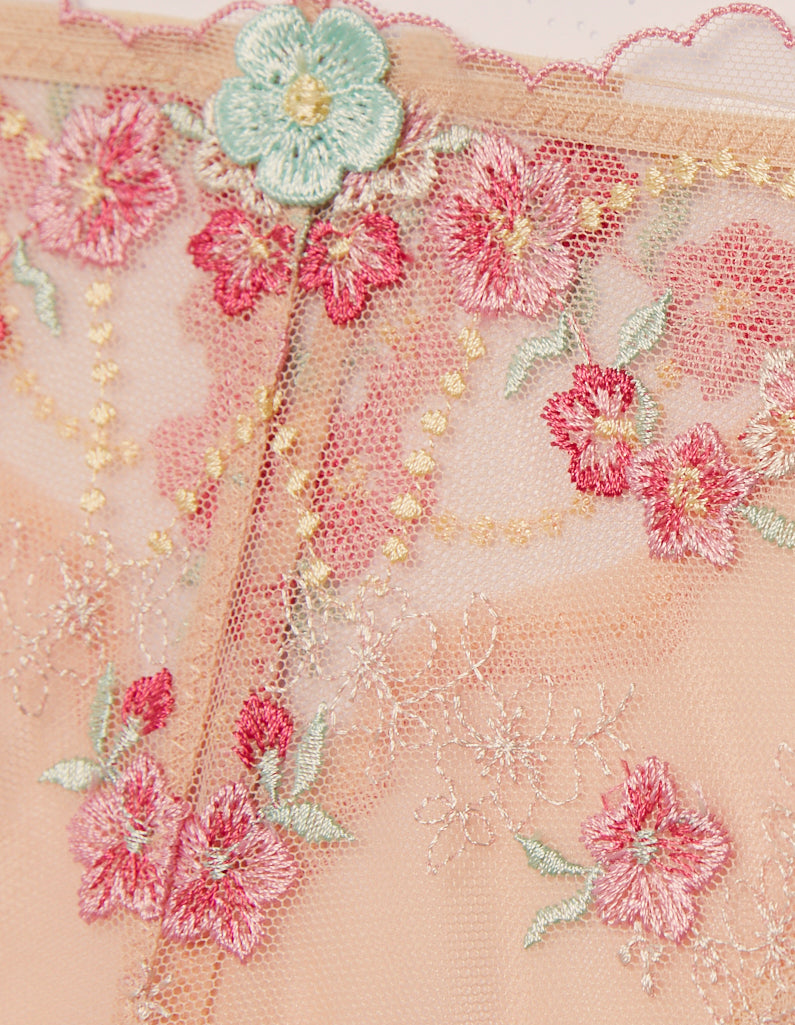 Culotte brésilienne en tulle et dentelle avec broderie florale dans les tons roses, avec un gousset en coton.
