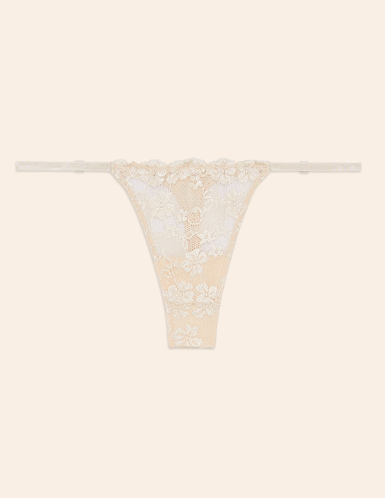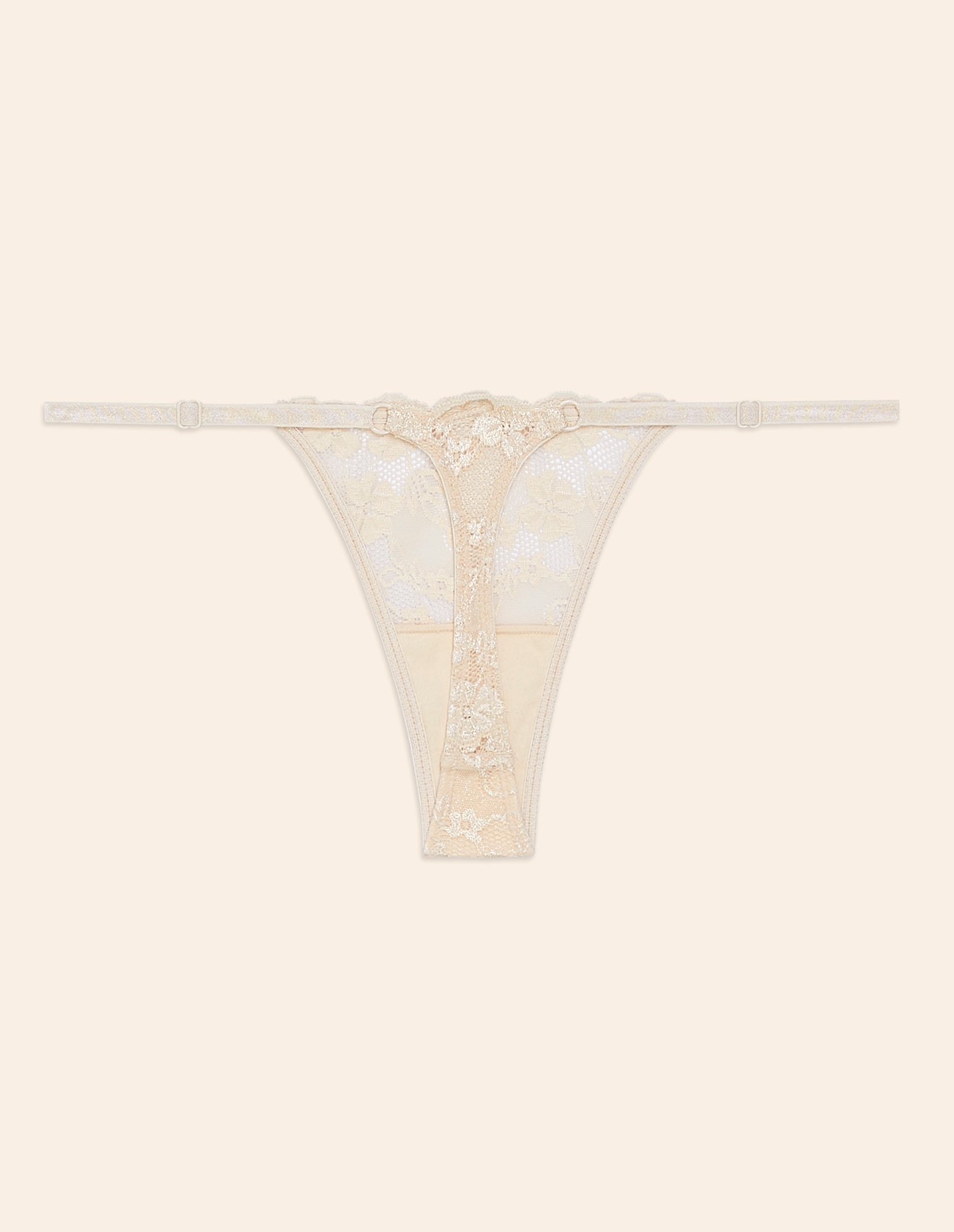 String échancré en dentelle brodée raffinée et tulle crème. Côtés ajustables pour un maintien parfait et un confort garanti. DENTELLE ENDUITE + MICROFIBRE, 90 % PA, 10 % EA.