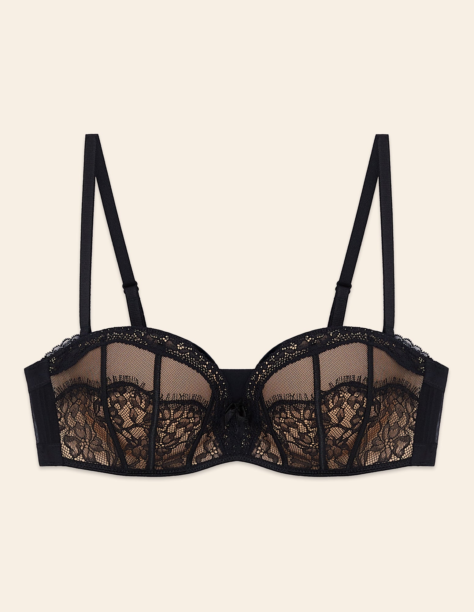 Soutien-gorge push-up sans bretelles Amélie avec armatures, bretelles amovibles et réglables. Dentelle noire douce et tulle en fibres recyclées. Petites baleines en plastique sur les côtés des bonnets pour un maintien parfait. Une fine double couche de silicone sous la poitrine et sur les bandes du dos assure un maintien optimal tout au long de la journée. Idéal pour les tenues bustier ou décolletées.