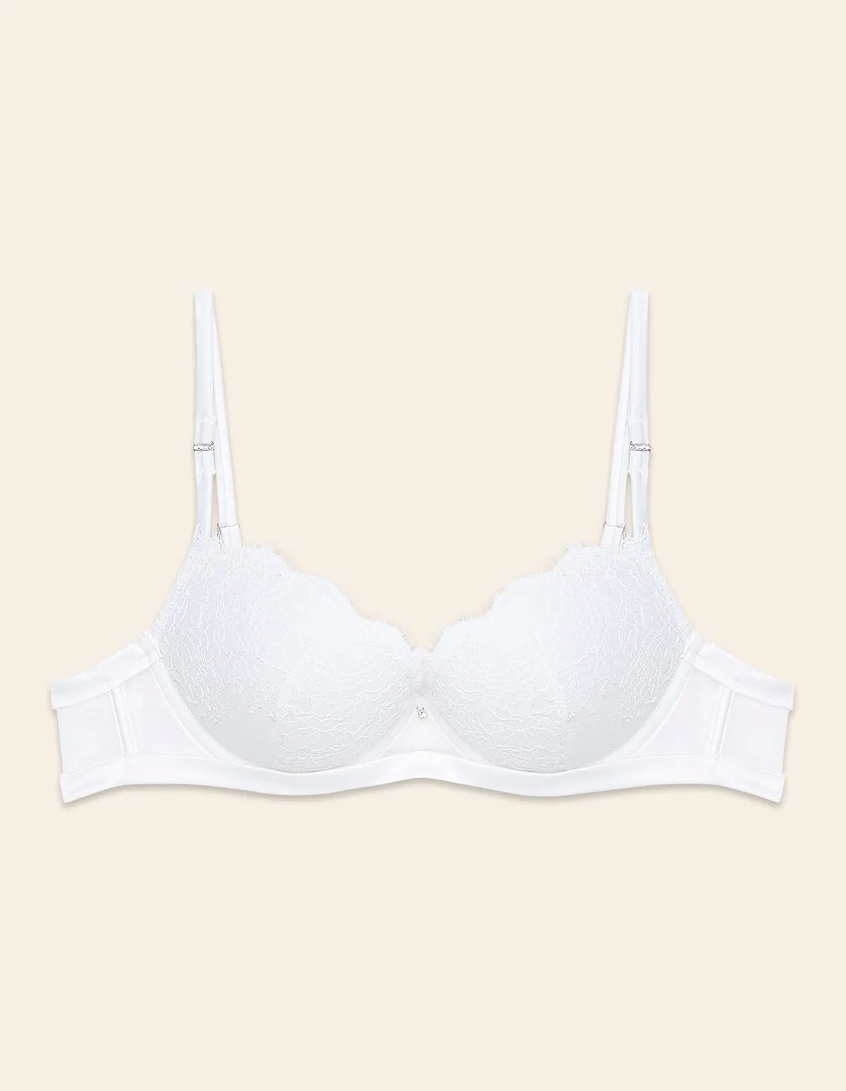 Collection Jasmine, d’un blanc immaculé, un choix parfait pour la lingerie de mariée. Soutien-gorge push-up à armatures et fines bretelles réglables, orné de petits strass sur le devant. Confectionné en dentelle, tulle et résille, il est orné d’empiècements en satin et d’un petit strass à l’entre-bonnet. Petites baleines verticales semi-rigides sur les côtés pour un maintien optimal.