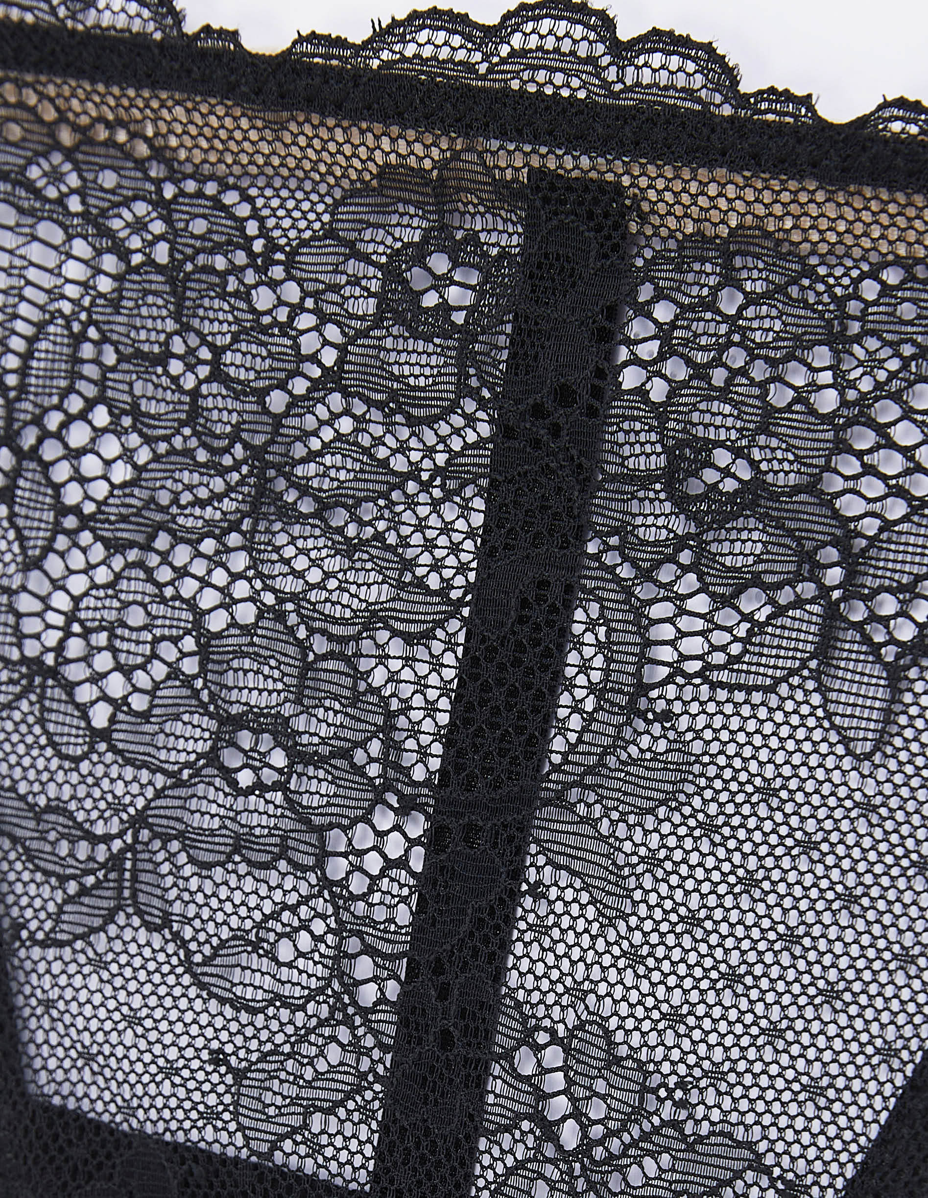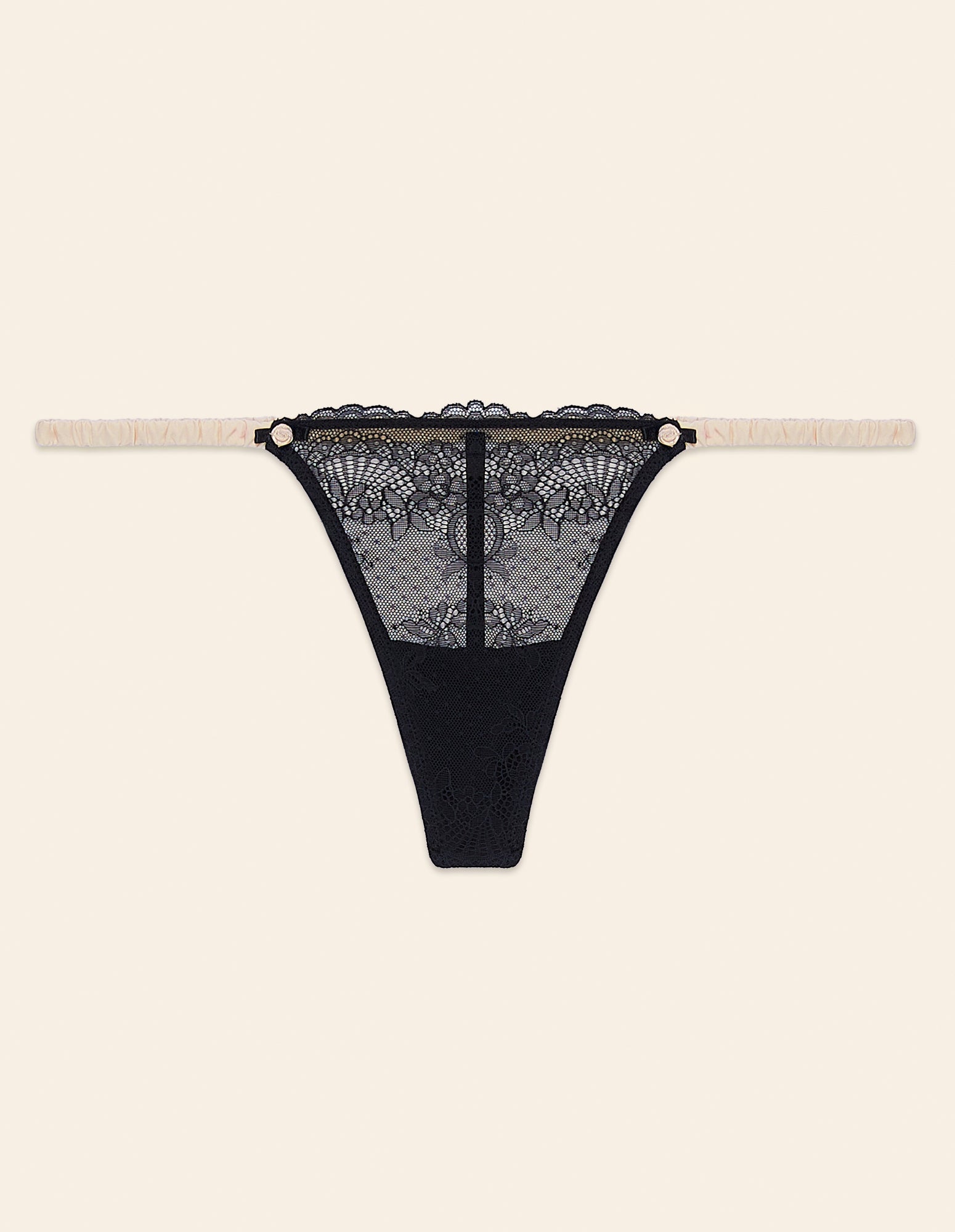 CamilleThong taille basse avec dos sans coutures et petit nœud en satin et détail rose sur le devant. Bordure en dentelle noire avec côtés recouverts de microfibre rose poudré, confectionné à partir de fibres recyclées.