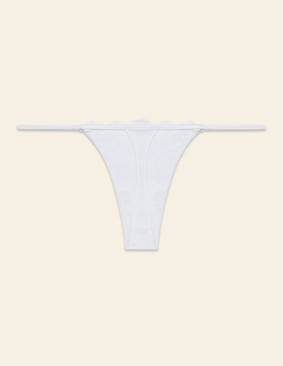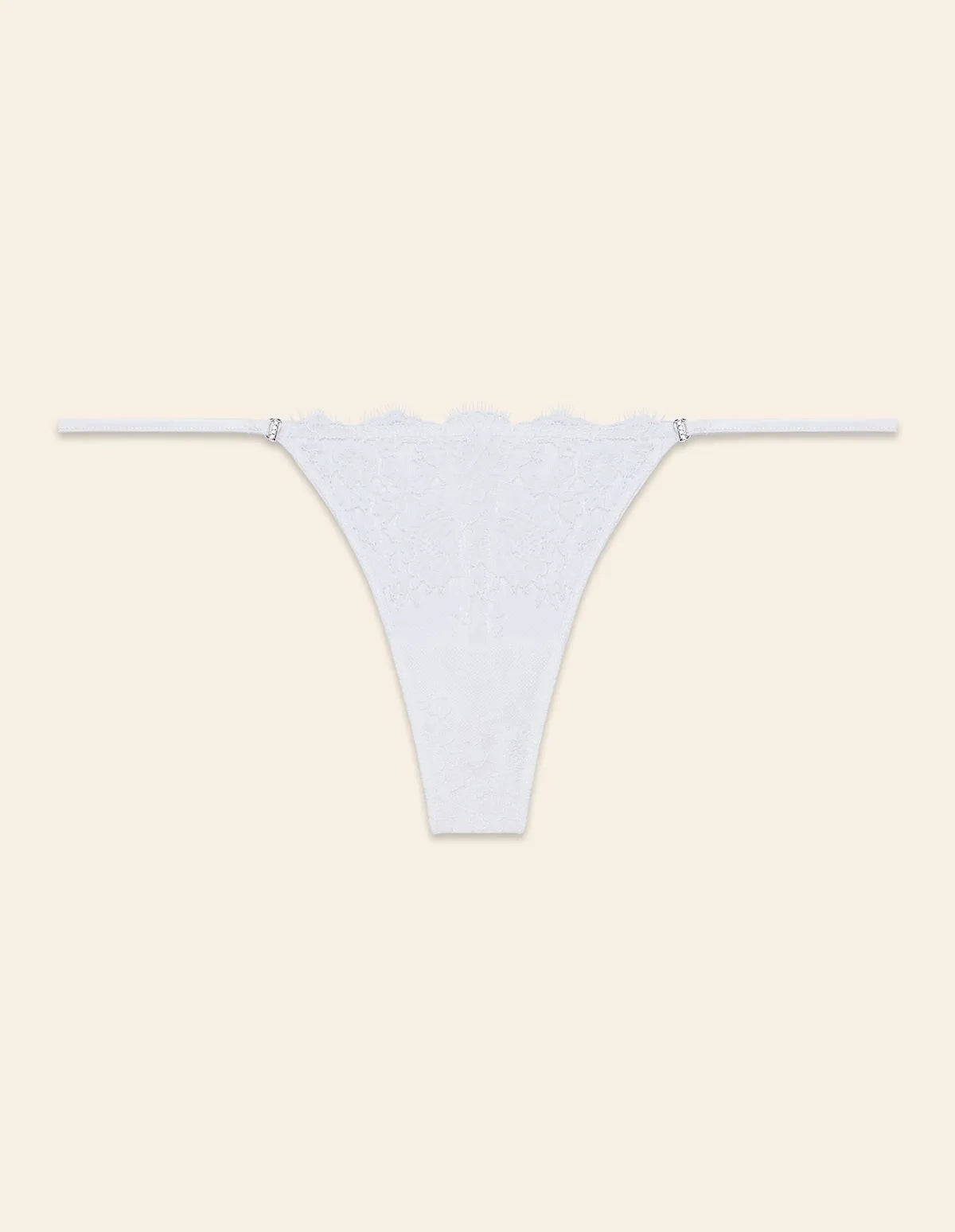 Collection Jasmine, d’un blanc immaculé, un choix parfait pour la lingerie de mariée. String en dentelle et tulle, effet semi-transparent avec empiècements en satin. Échancrure sur les côtés, avec petits strass à l’attache du panneau avant.