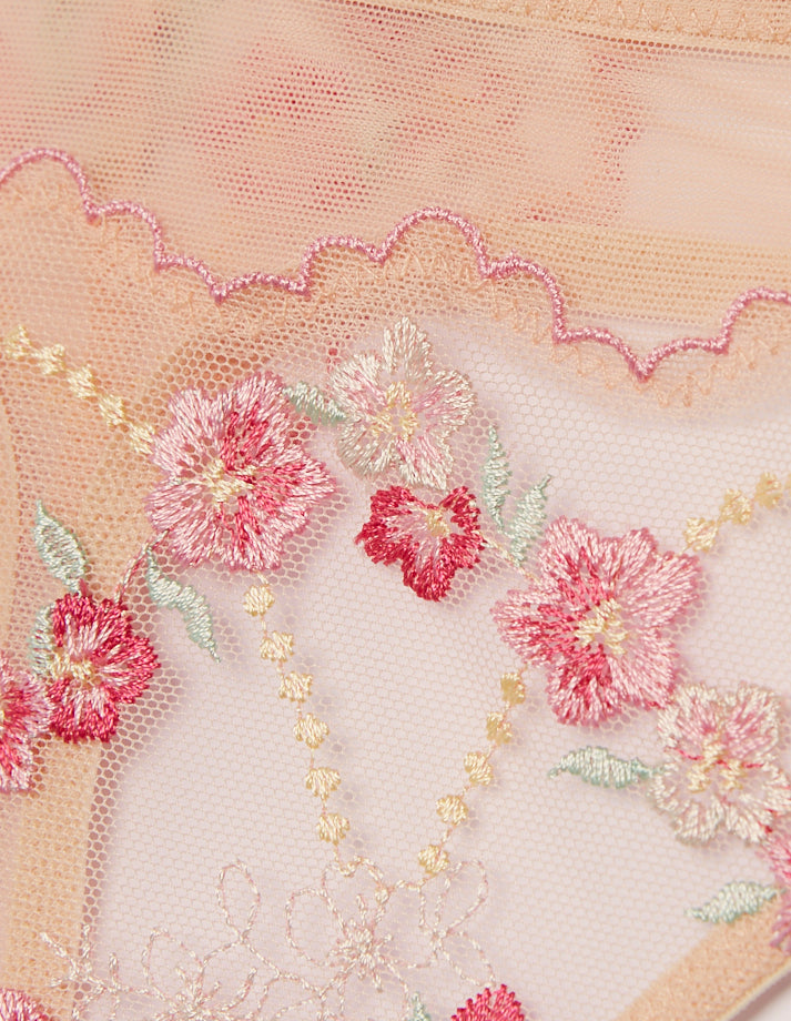 String en tulle et dentelle, brodé de fleurs dans les tons roses, avec un gousset en coton. Le string Melissa est orné d’une petite fleur bleue au dos.