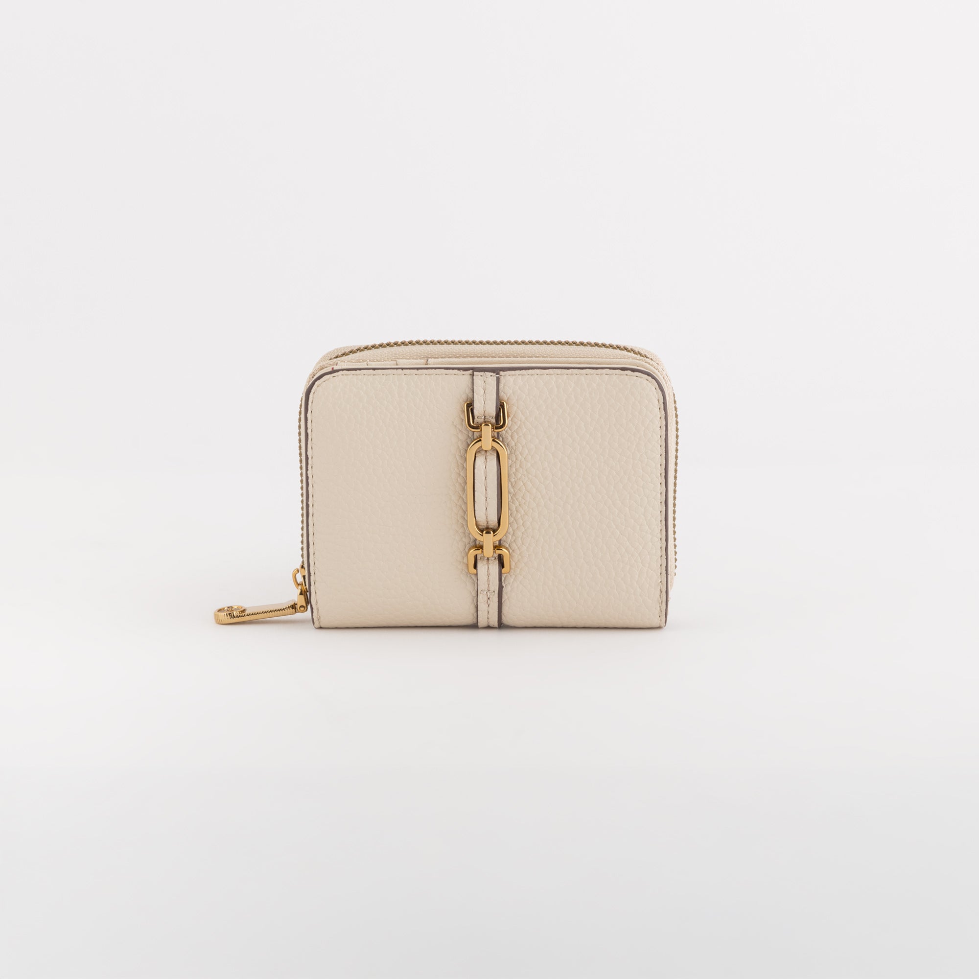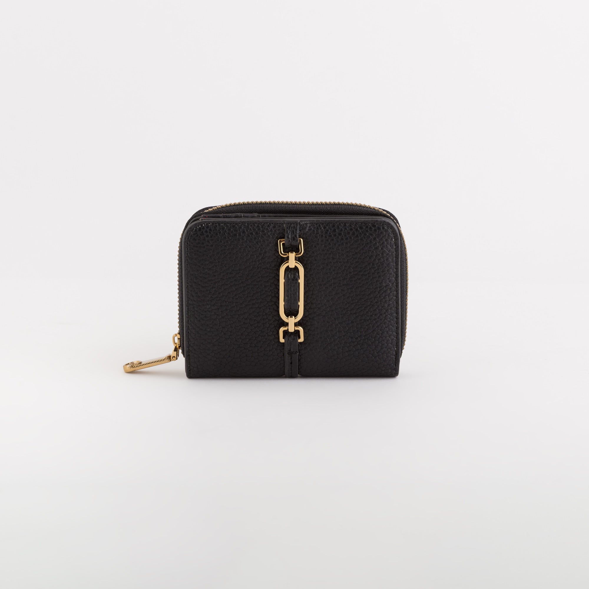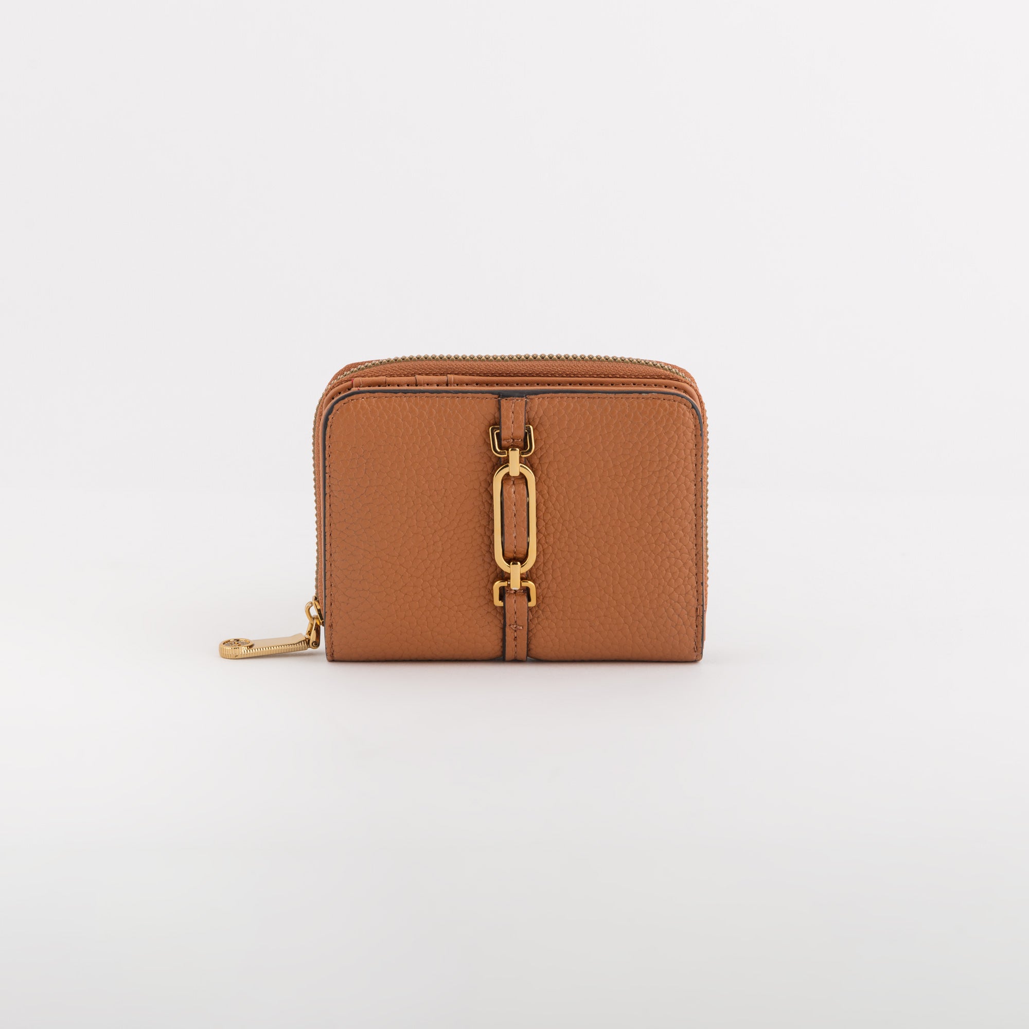 Petit portefeuille de la ligne Giulia de Carpisa en PU grenat et doté d’un accessoire frontal unique inspiré des colonnes des monuments romains.