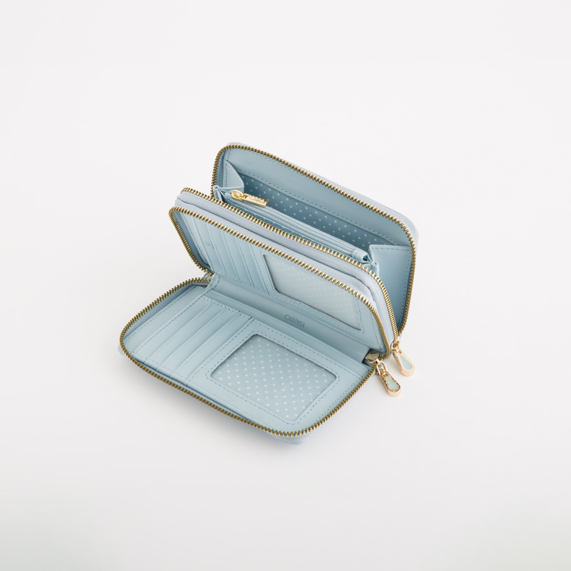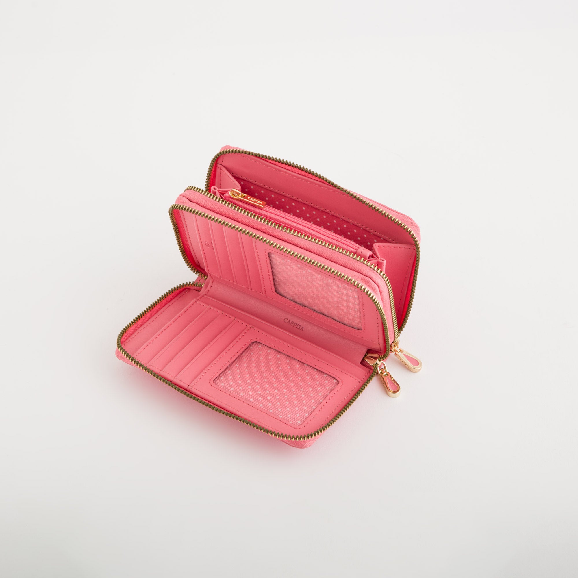 Ce modèle comporte deux compartiments zippés. L’un contient une poche à billets, dix emplacements pour cartes et deux porte-documents. Le second compartiment est doté d’une poche zippée pour la monnaie. 100 % polyuréthane.