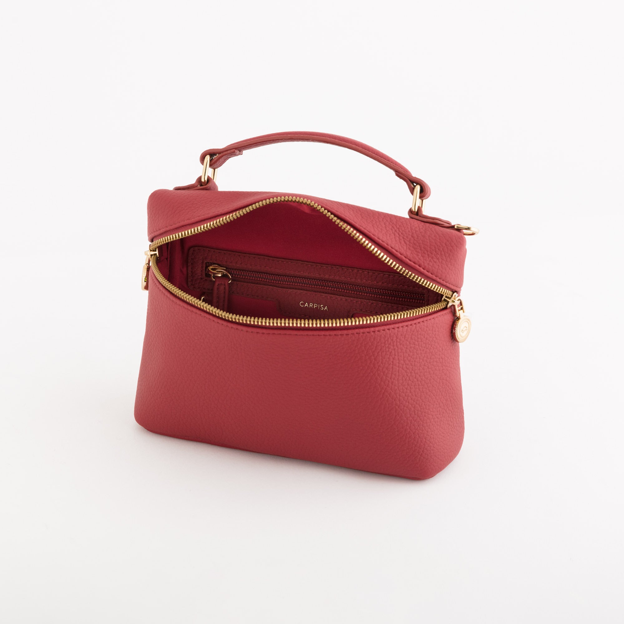Sac bandoulière de la ligne Flaminia de Carpisa en PU grenat. Ce modèle est doté d’une fermeture zippée avec double tirette médaillon en laiton satiné, d’une poche intérieure, d’une poignée supérieure et d’une bandoulière réglable et amovible.