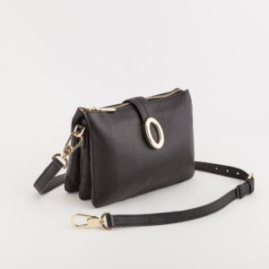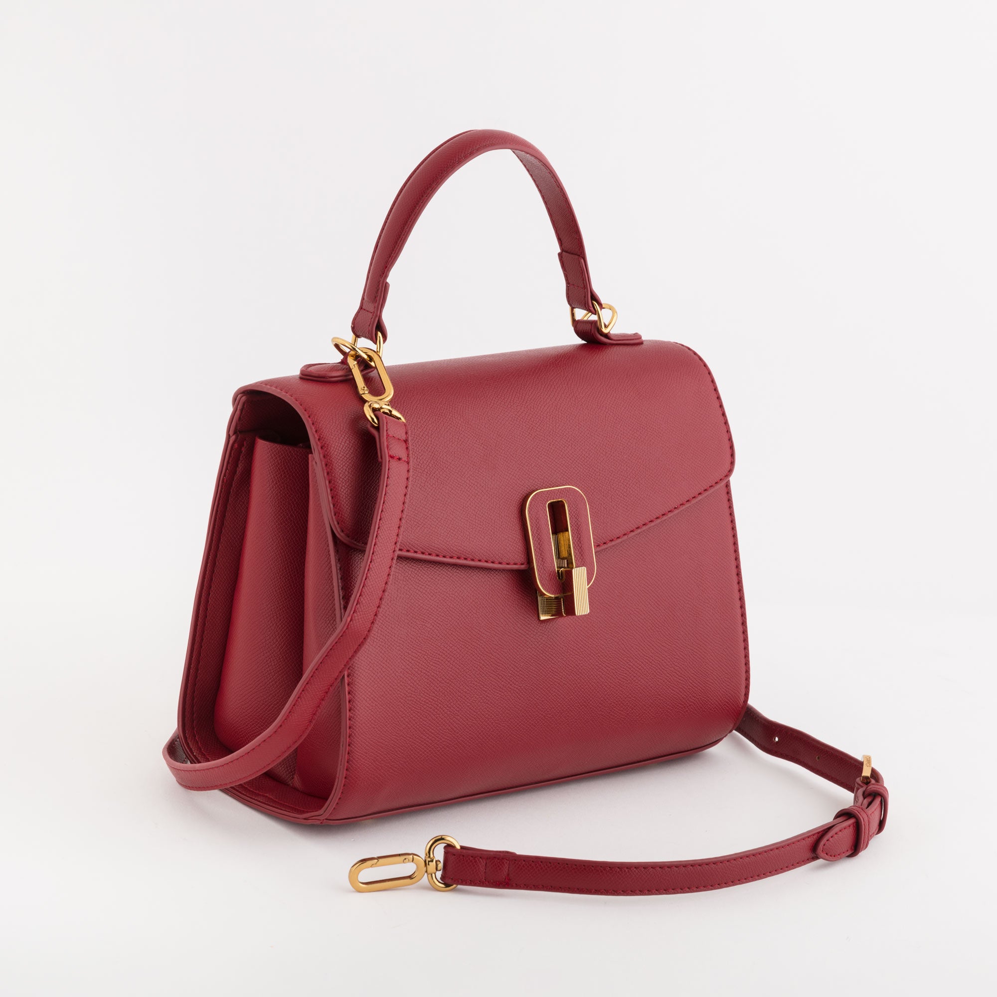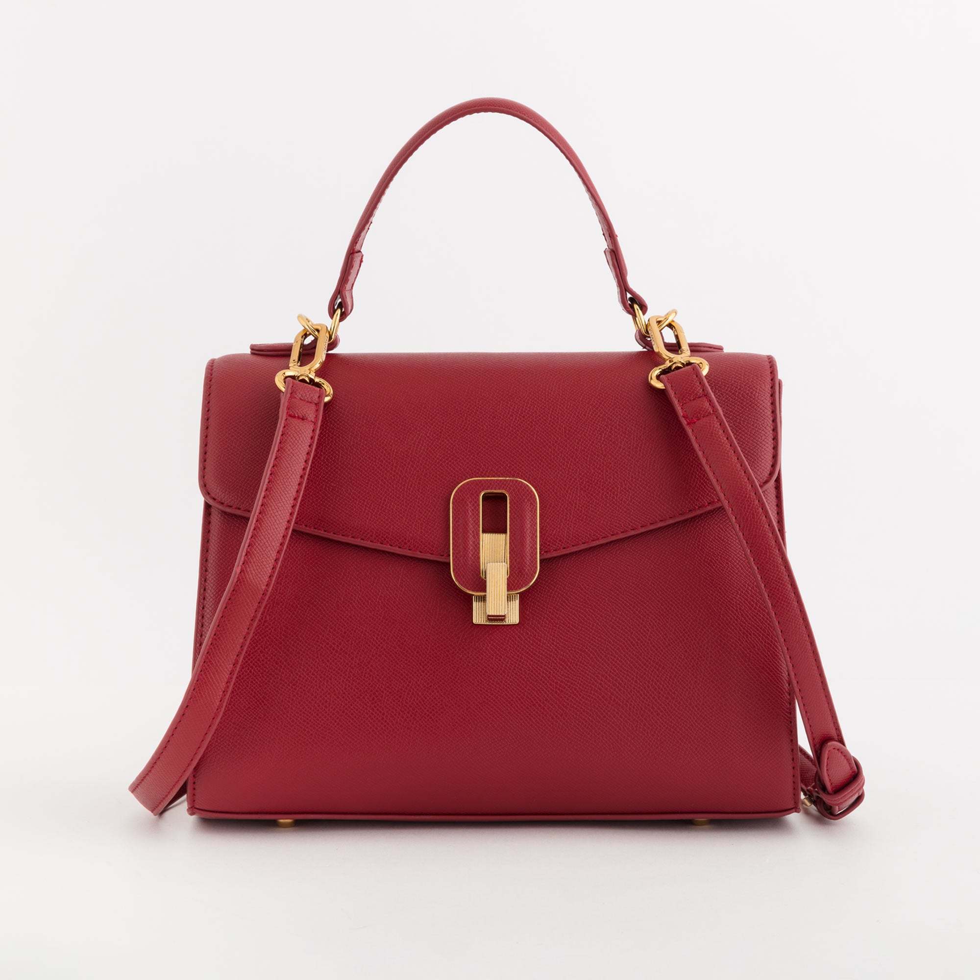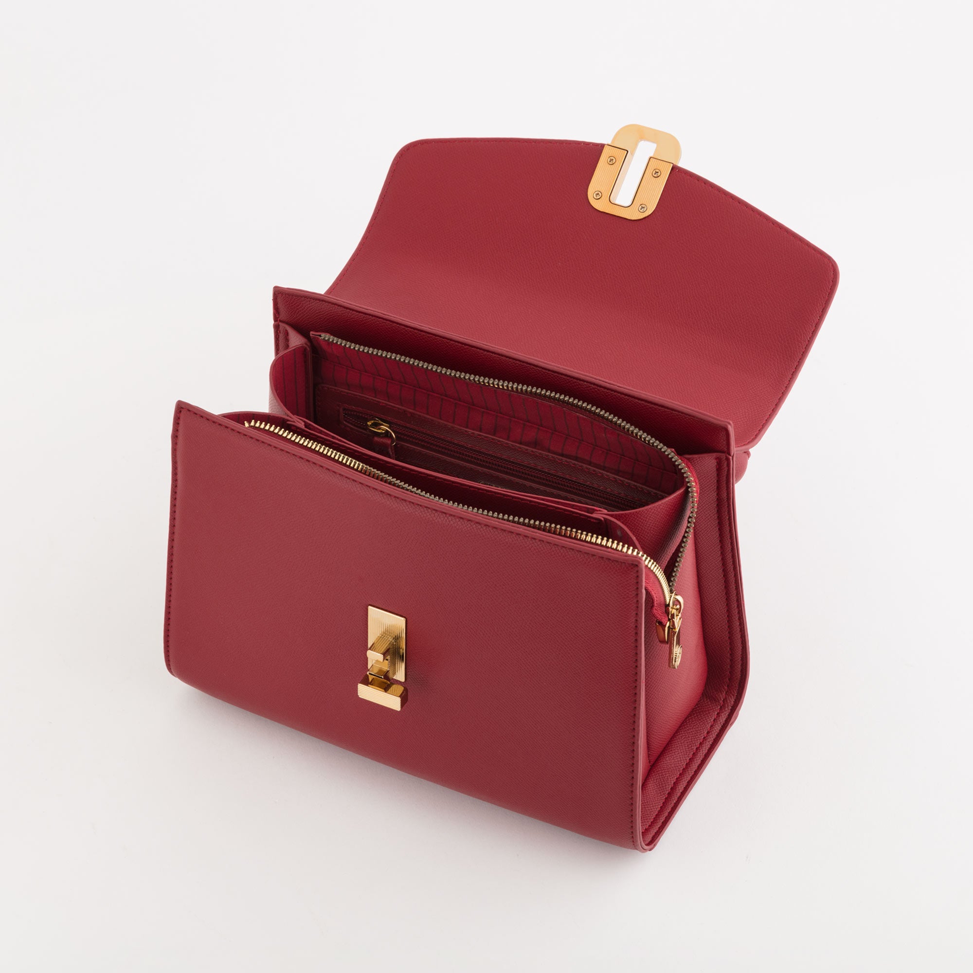 Le fermoir en métal émaillé, inspiré de l’architecture romaine, devient un détail emblématique qui sublime le design. La doublure rouge pompéien apporte une touche distinctive et raffinée.