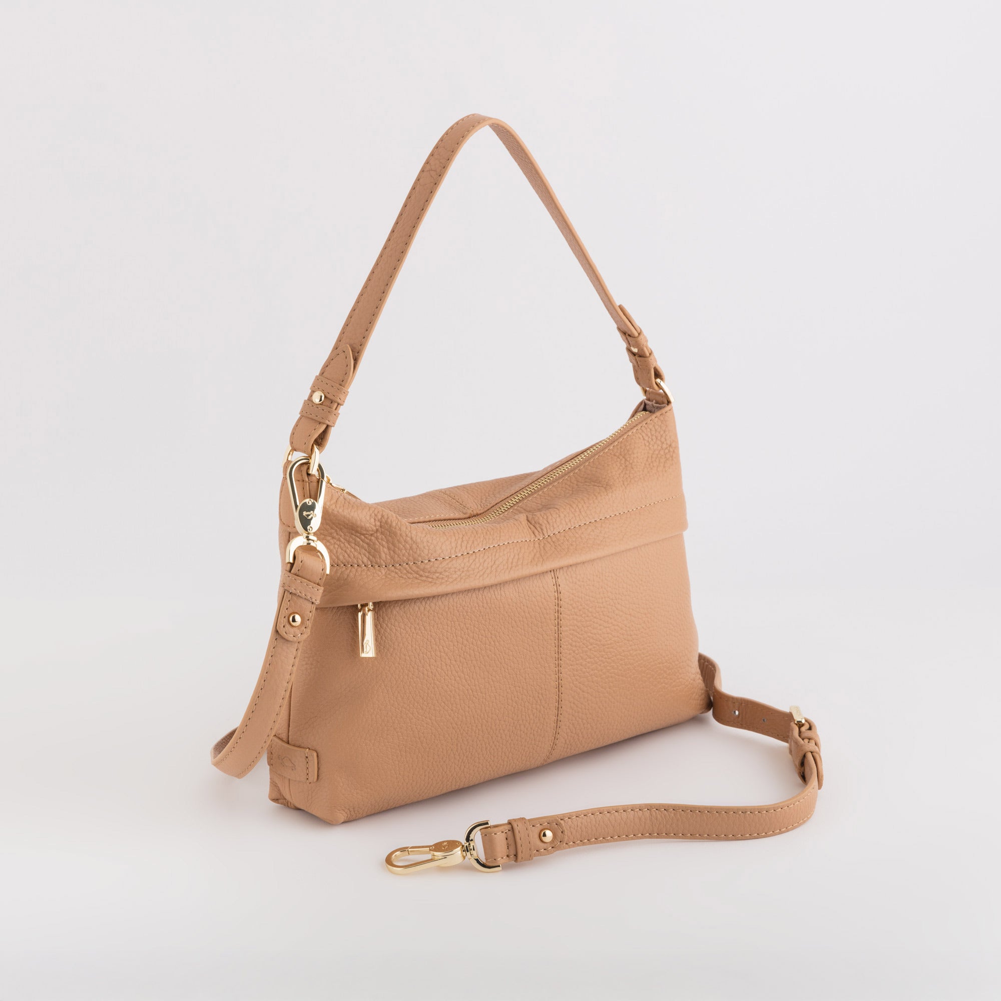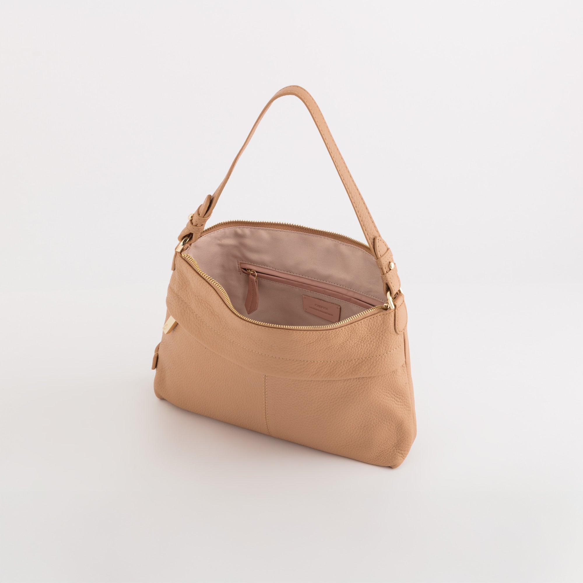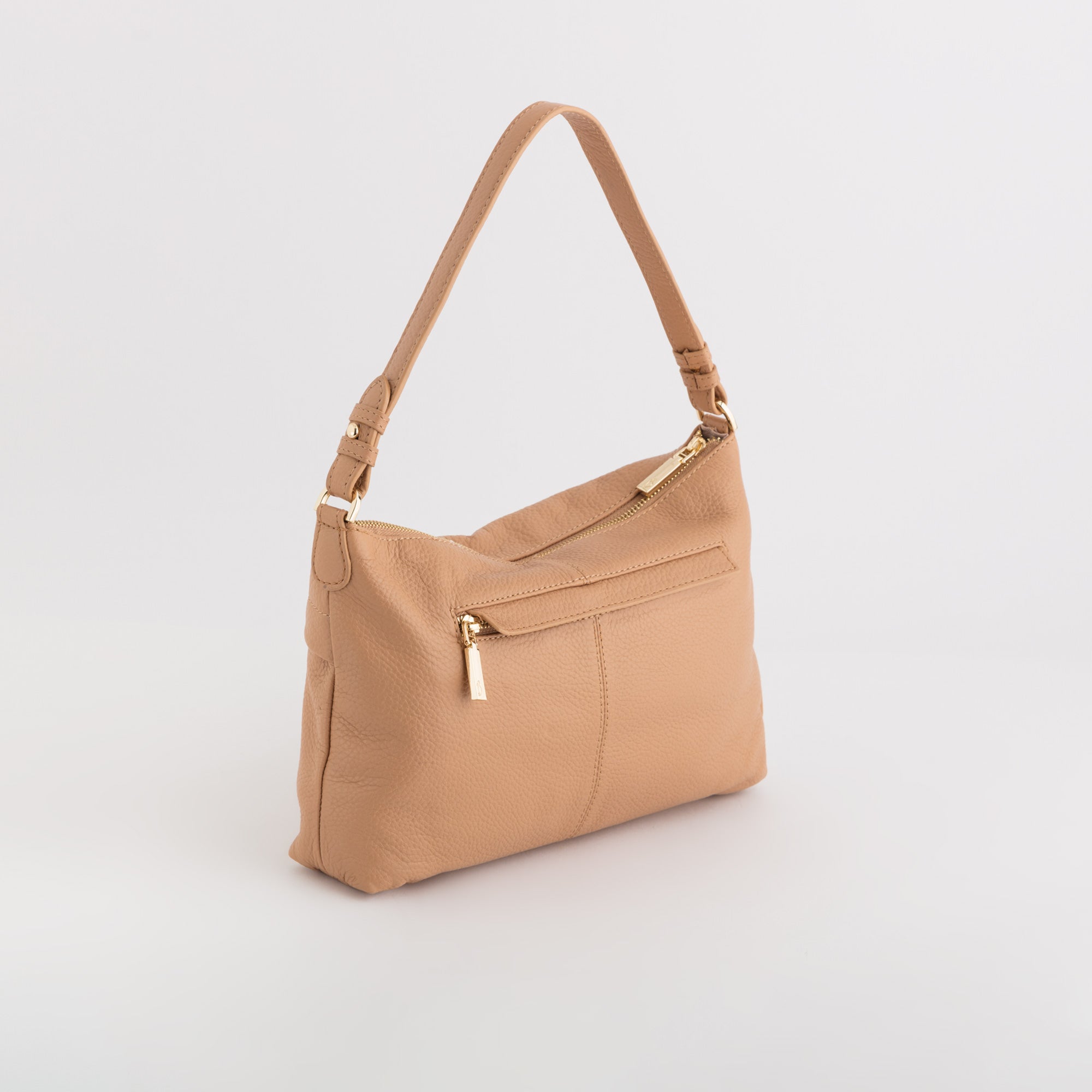 Sac bandoulière en cuir grainé de la collection Atena de Carpisa. Il est doté d’un compartiment principal zippé, de trois poches intérieures, de deux poches extérieures (une à l’avant et une à l’arrière), d’une poignée pour un porté épaule et d’une bandoulière réglable et amovible pour un porté croisé.