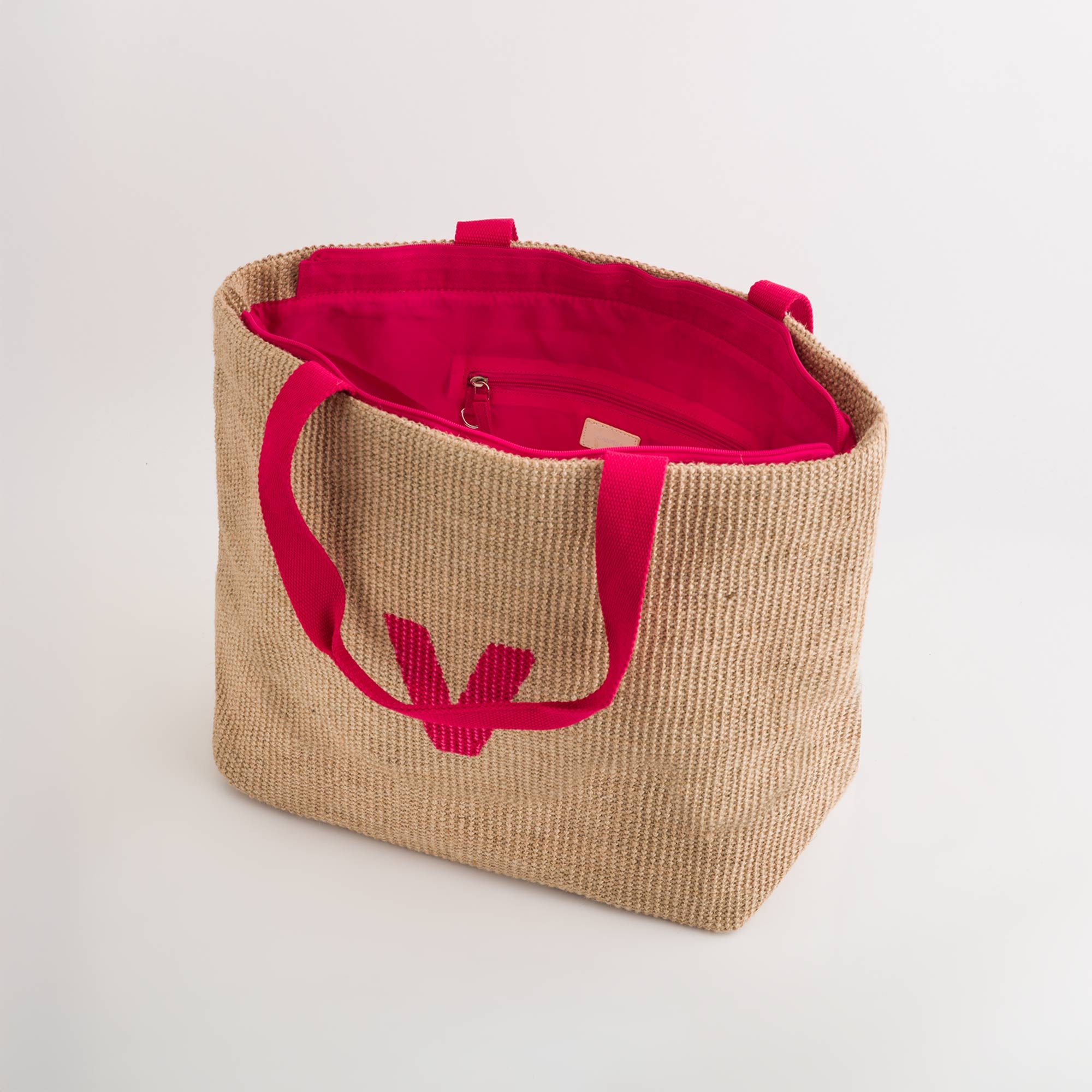Sac cabas de la collection Zante de Carpisa, en jute naturel, avec anses en ruban et doublure contrastante. Ce modèle est doté d’une fermeture zippée, de poches intérieures et d’une initiale.