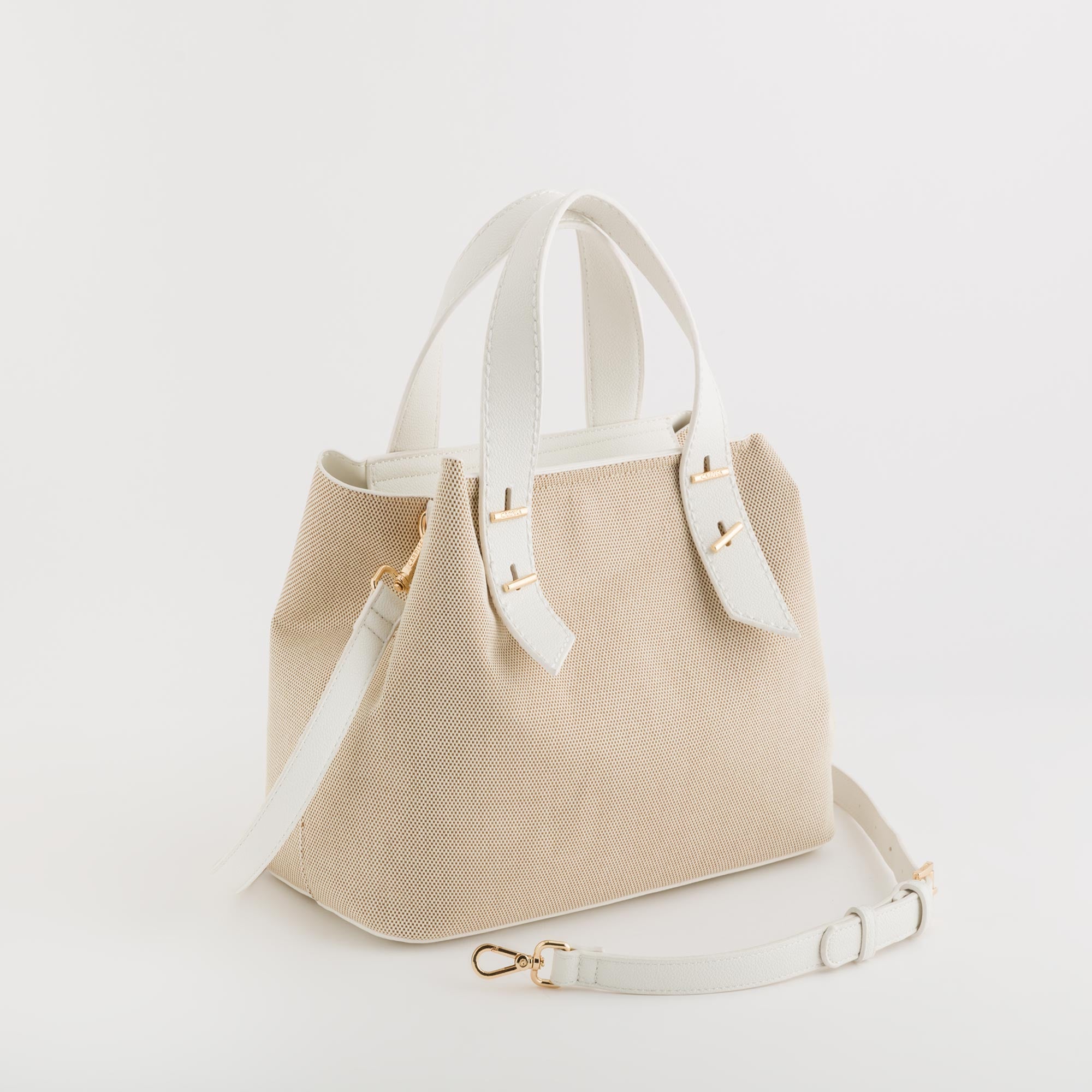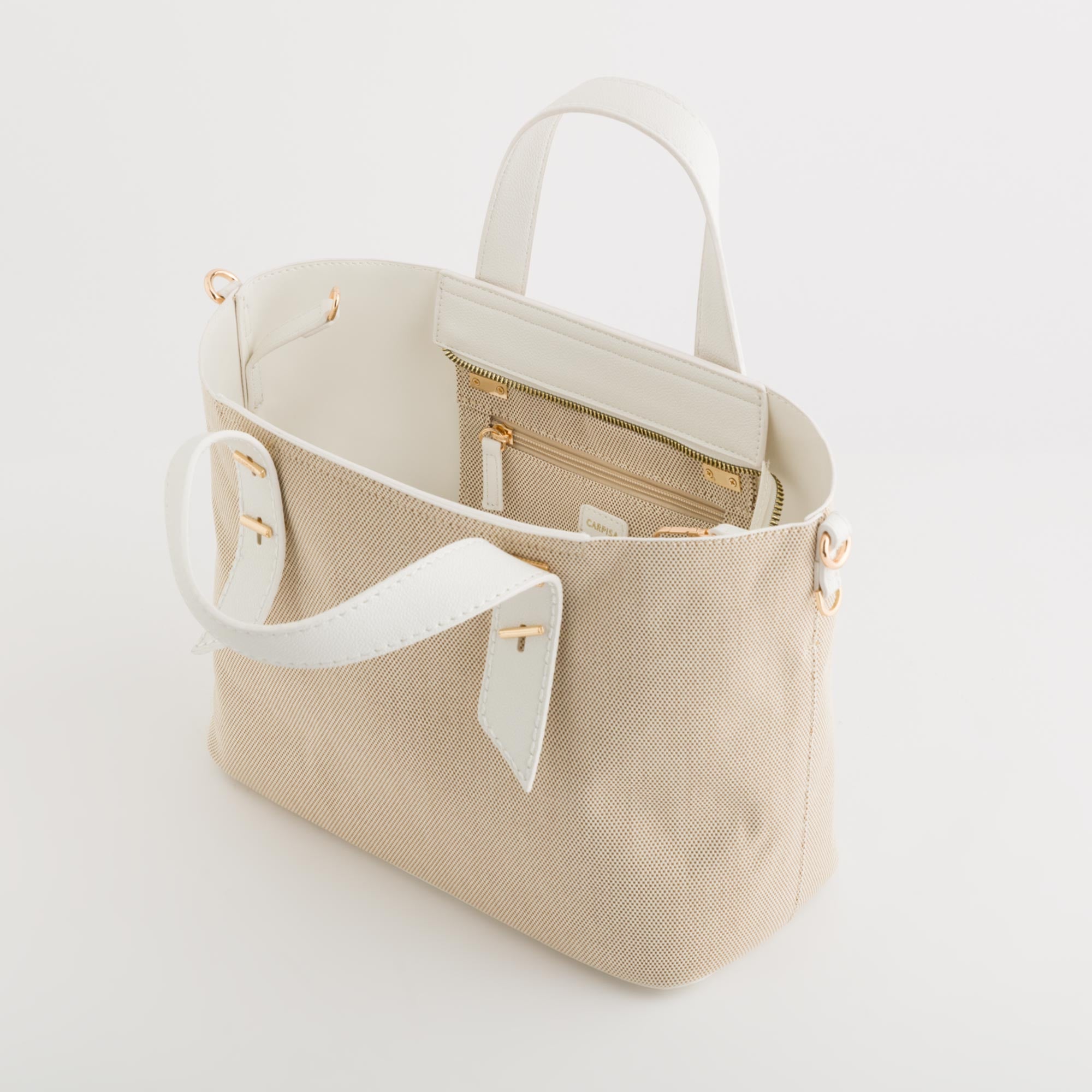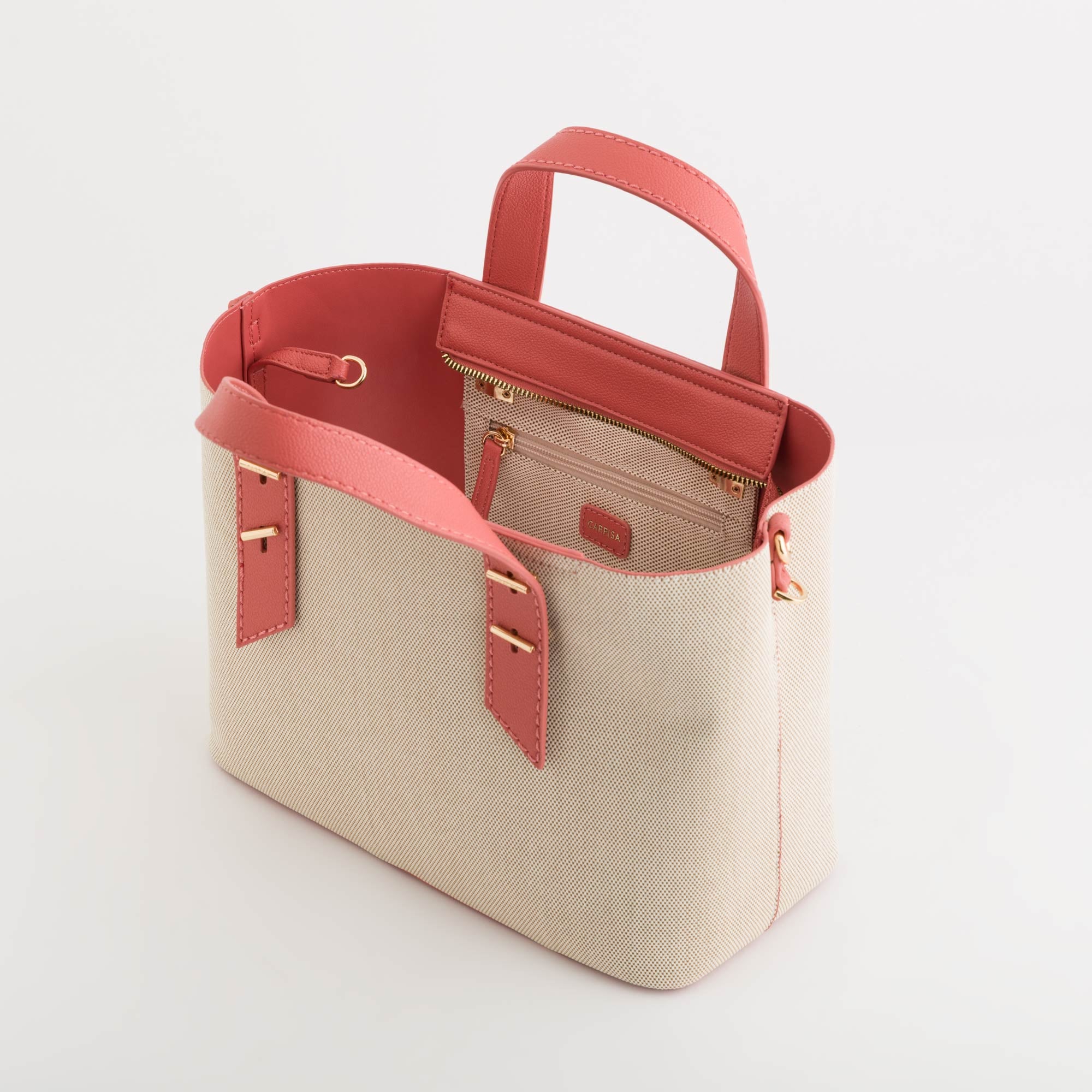 Sac à main de la ligne Calla de Carpisa, en tissu et PU de couleur contrastante.