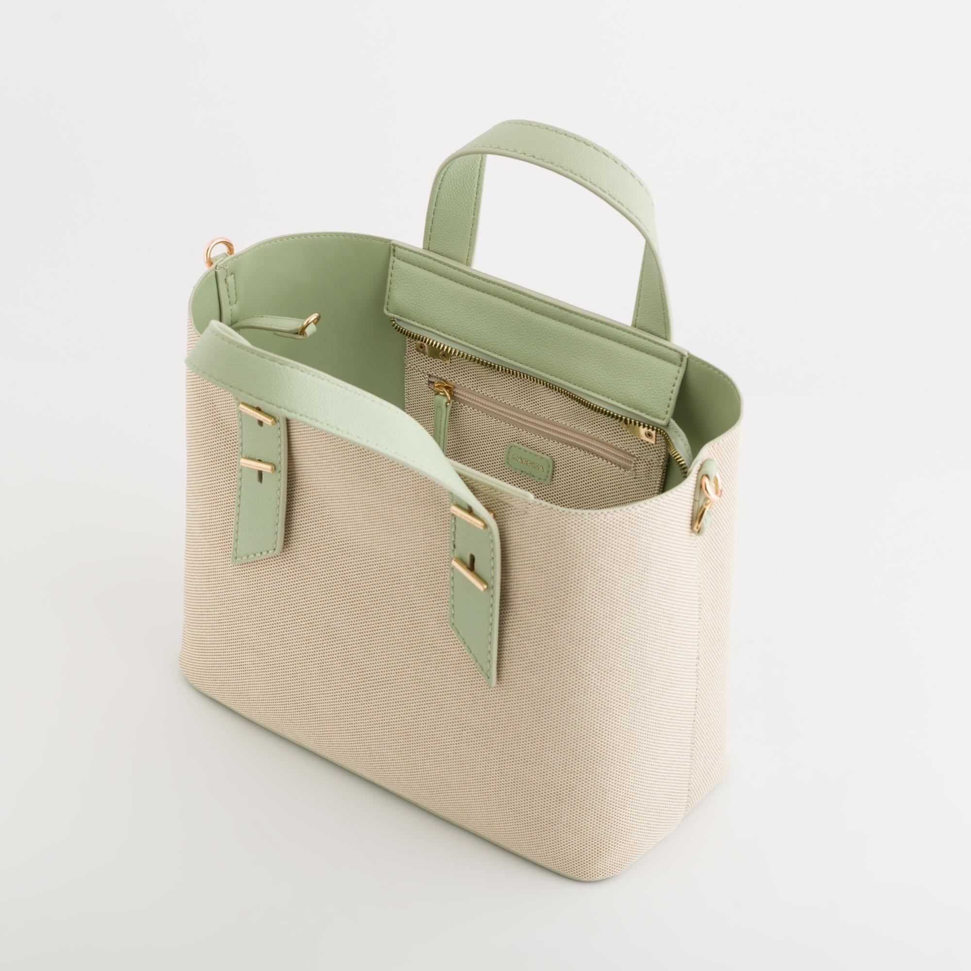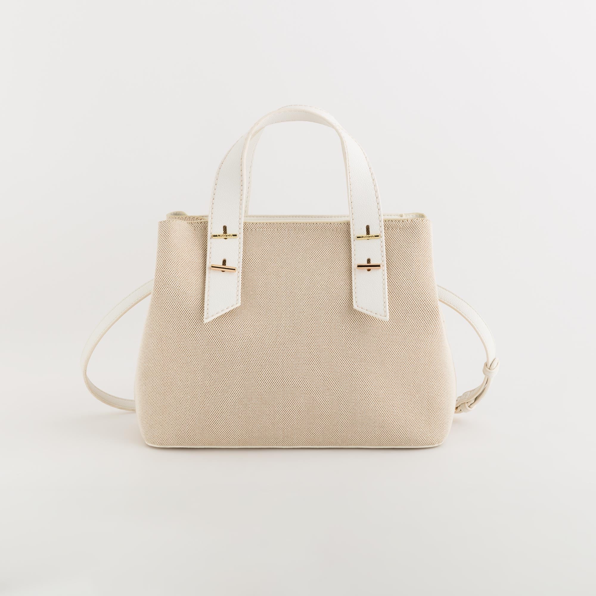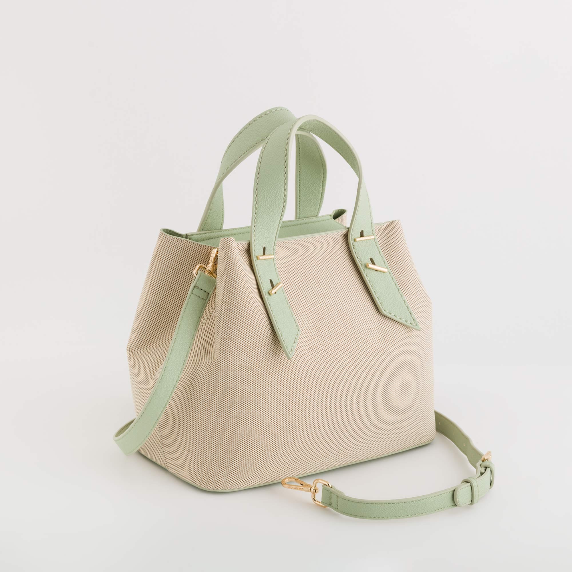 Sac à main de la ligne Calla de Carpisa, en tissu et PU de couleur contrastante.