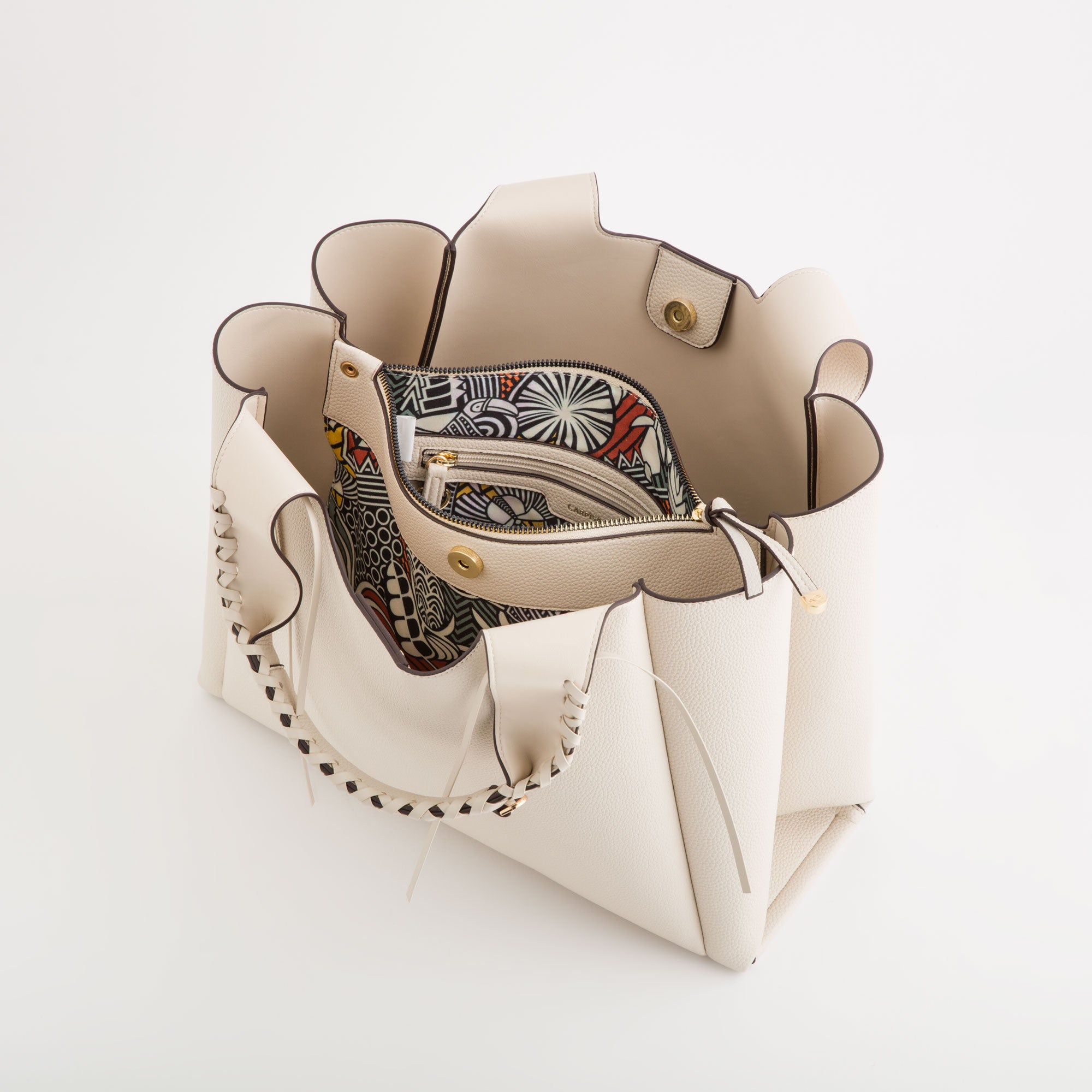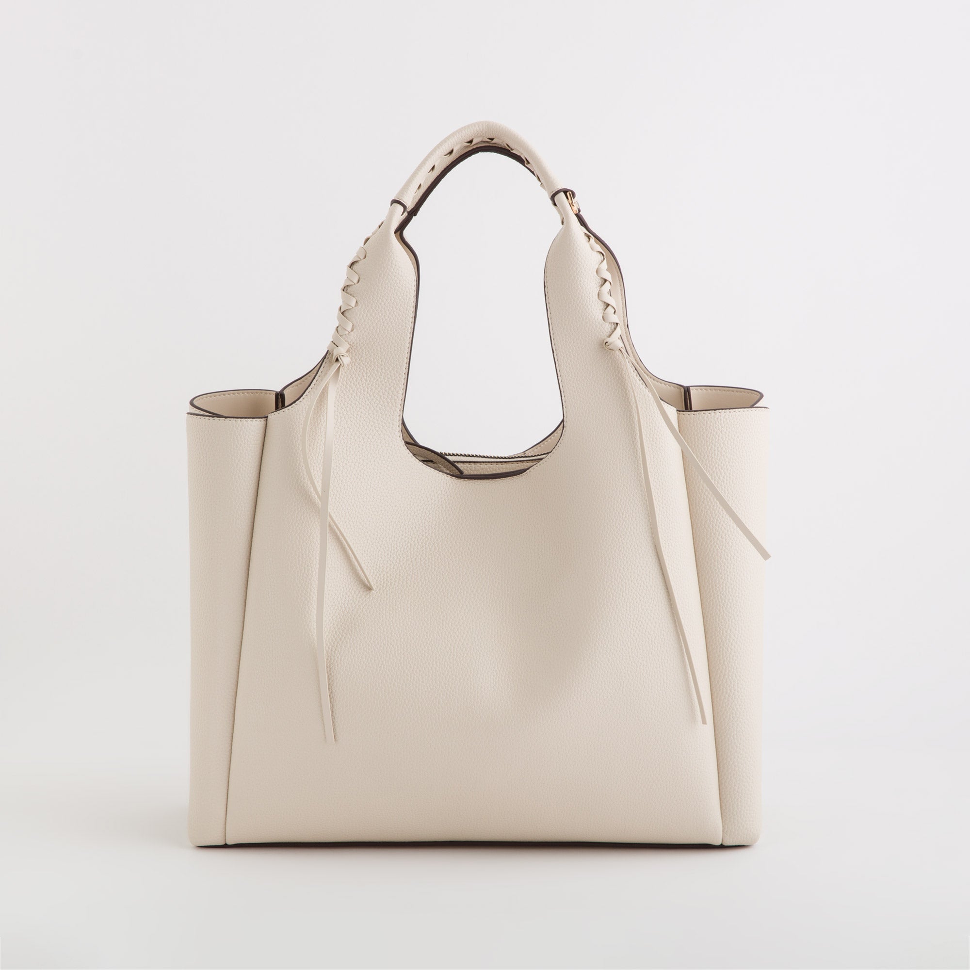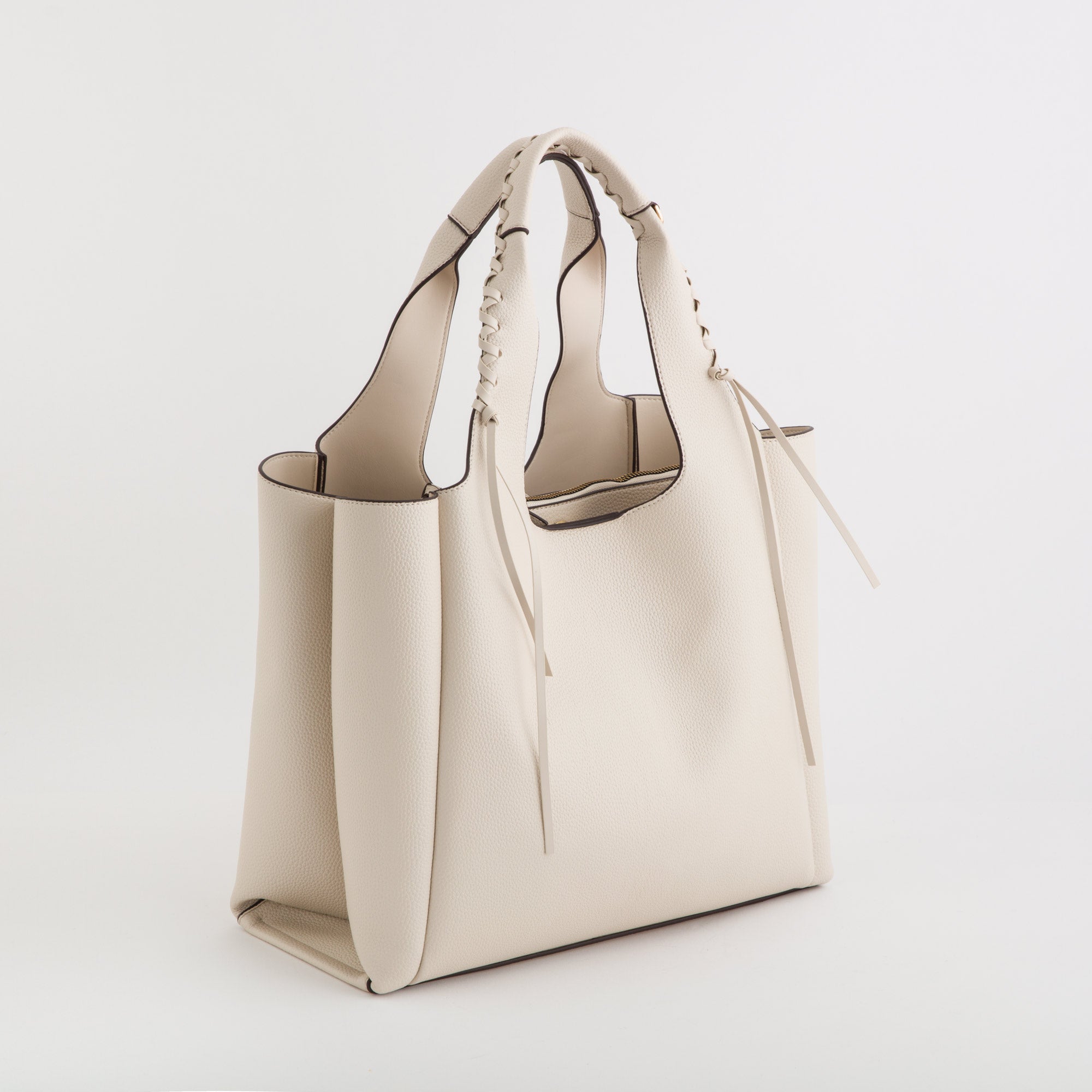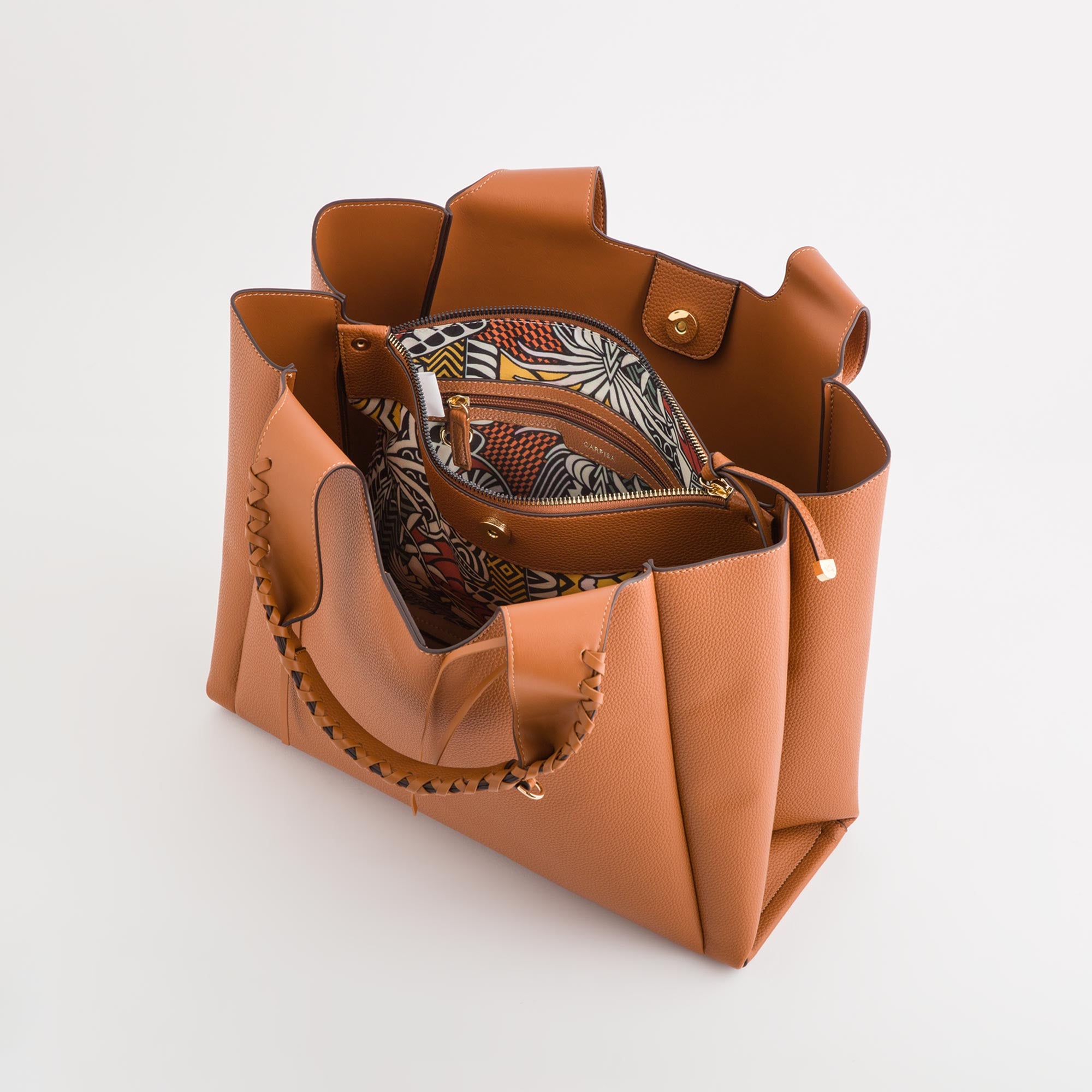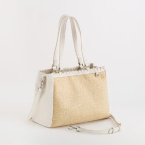 Le modèle, non doublé et aux dimensions généreuses, allie design et capacité et est équipé d’une fermeture à clip, de trois compartiments et de poignées enrichies de