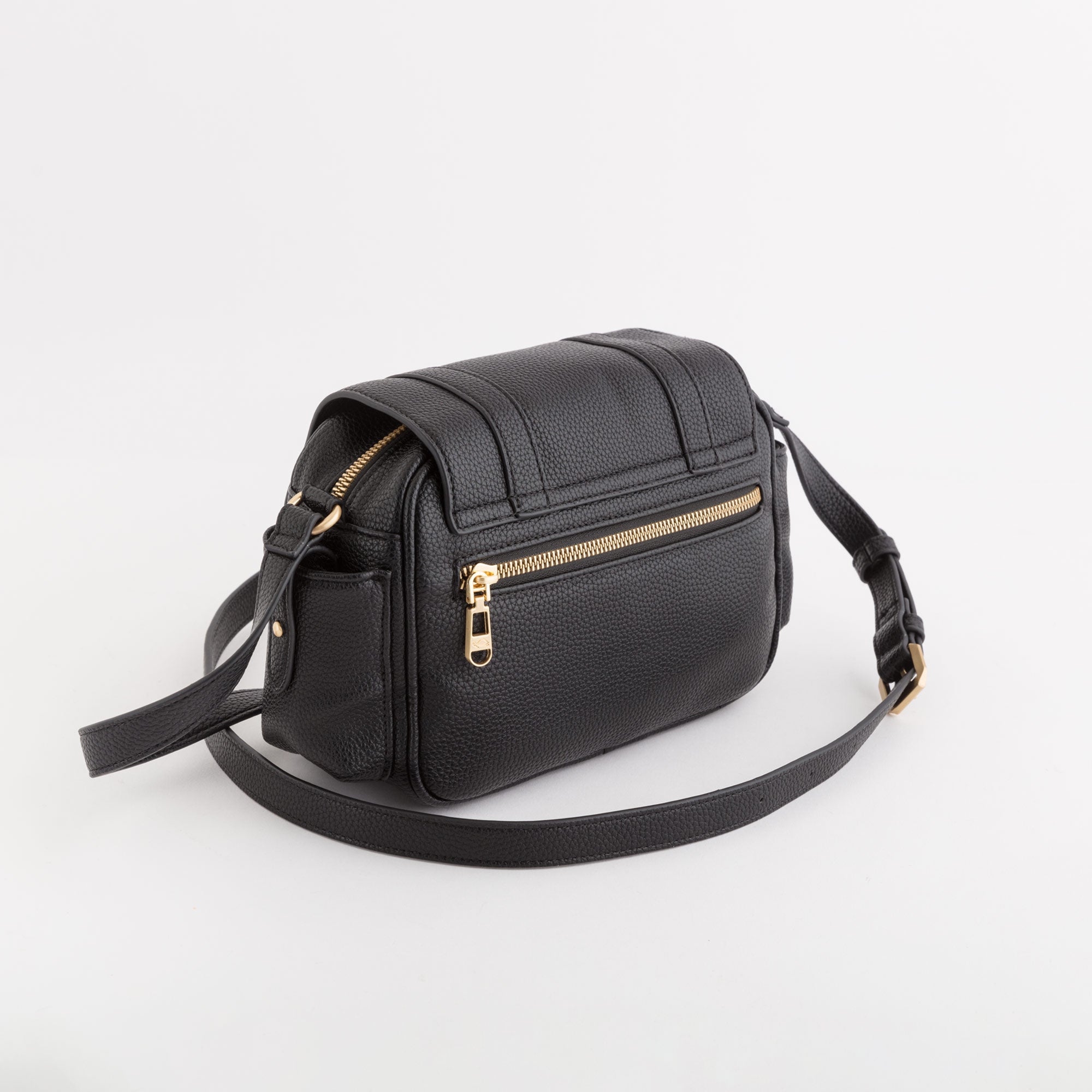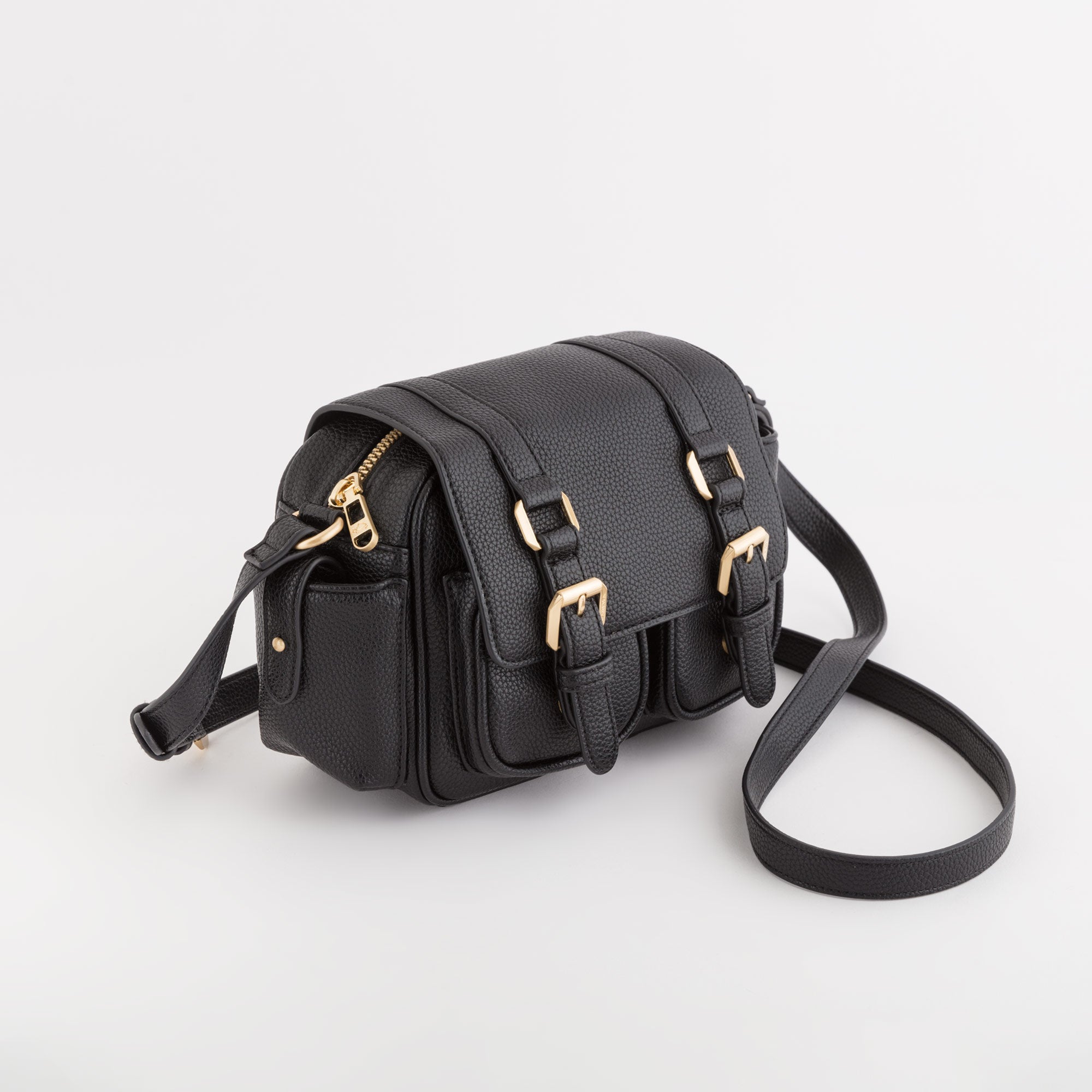 Le modèle est doté d’un rabat avec boucles à clip et fermeture zippée, de deux poches intérieures, de quatre poches extérieures (deux à l’avant et deux sur les côtés), d’une poche zippée au dos et d’une bandoulière réglable.