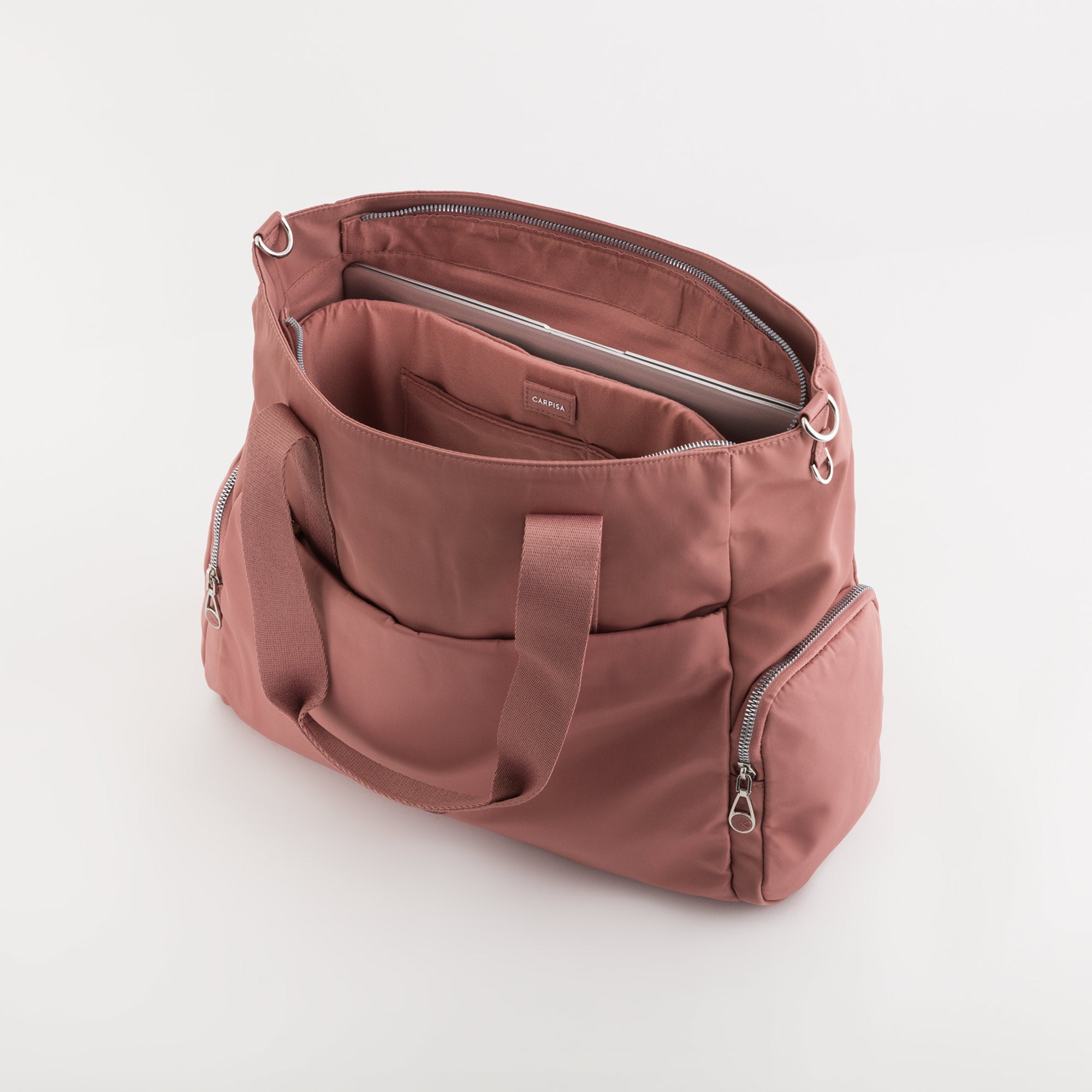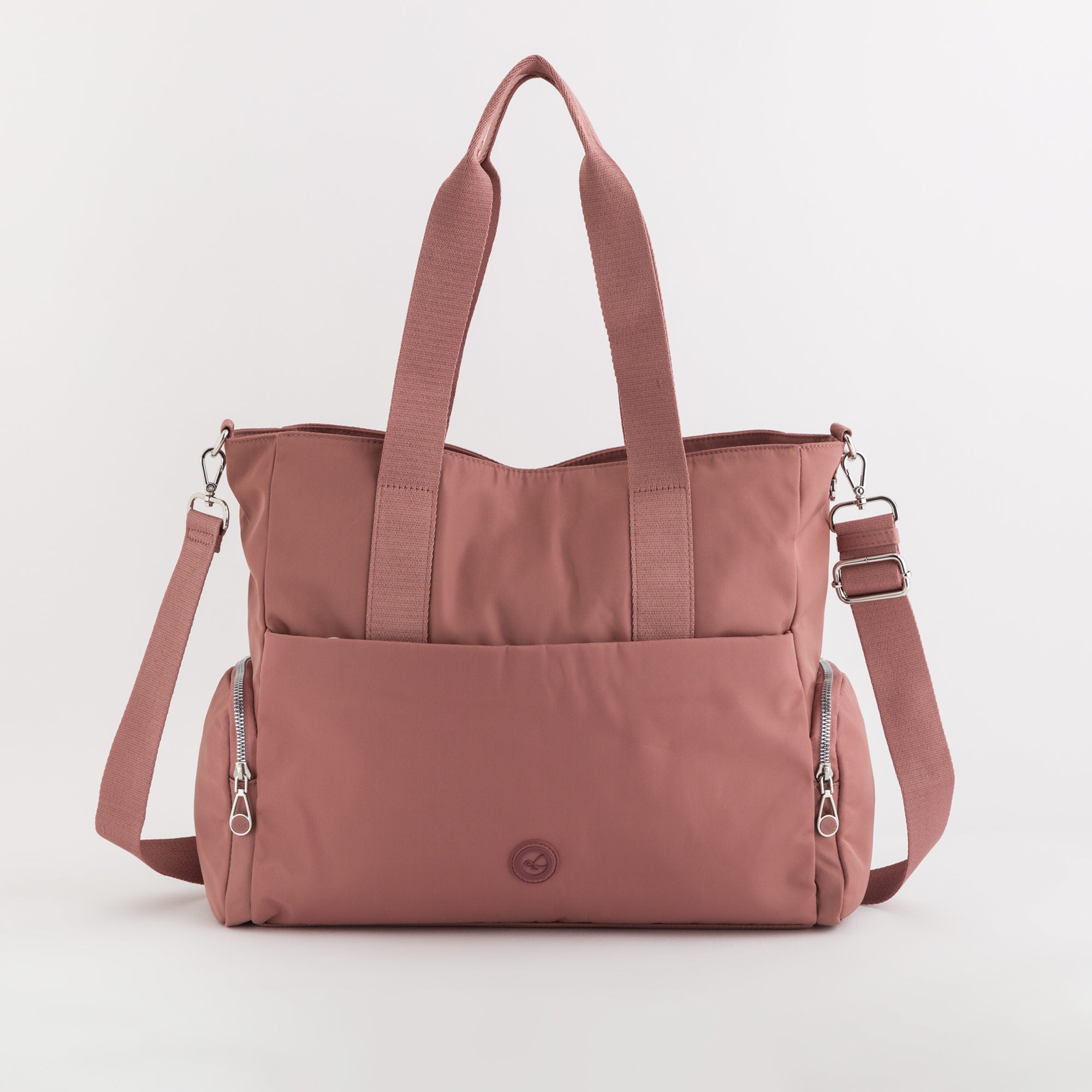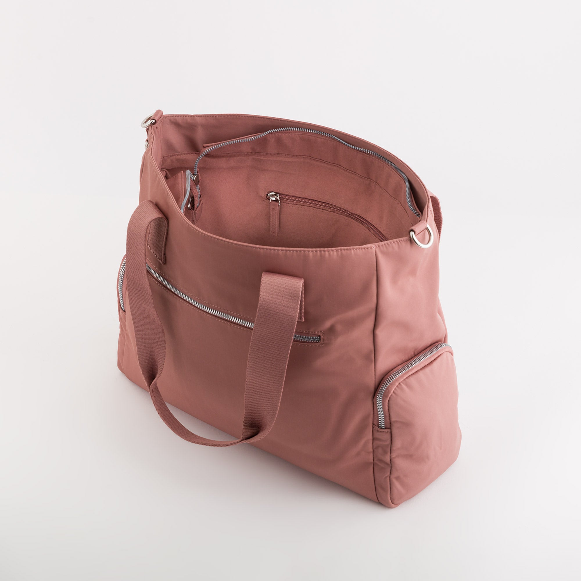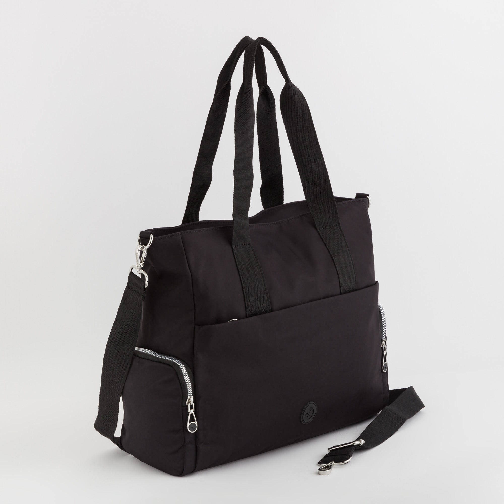 Le modèle est doté d’une fermeture zippée, de quatre poches intérieures, de quatre poches extérieures (une à l’avant, une à l’arrière et deux sur les côtés), de larges poignées et d’une bandoulière réglable et amovible.